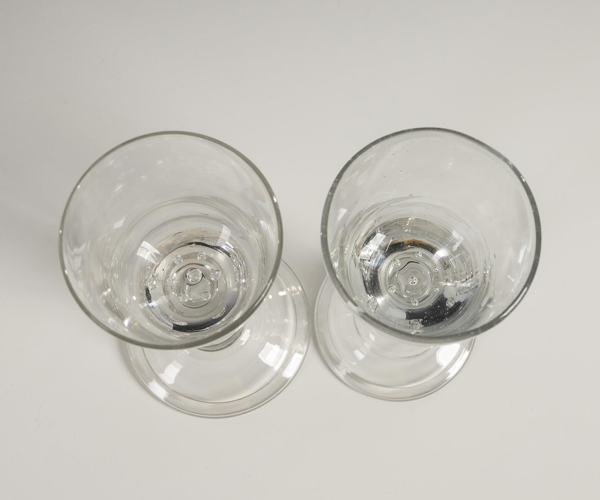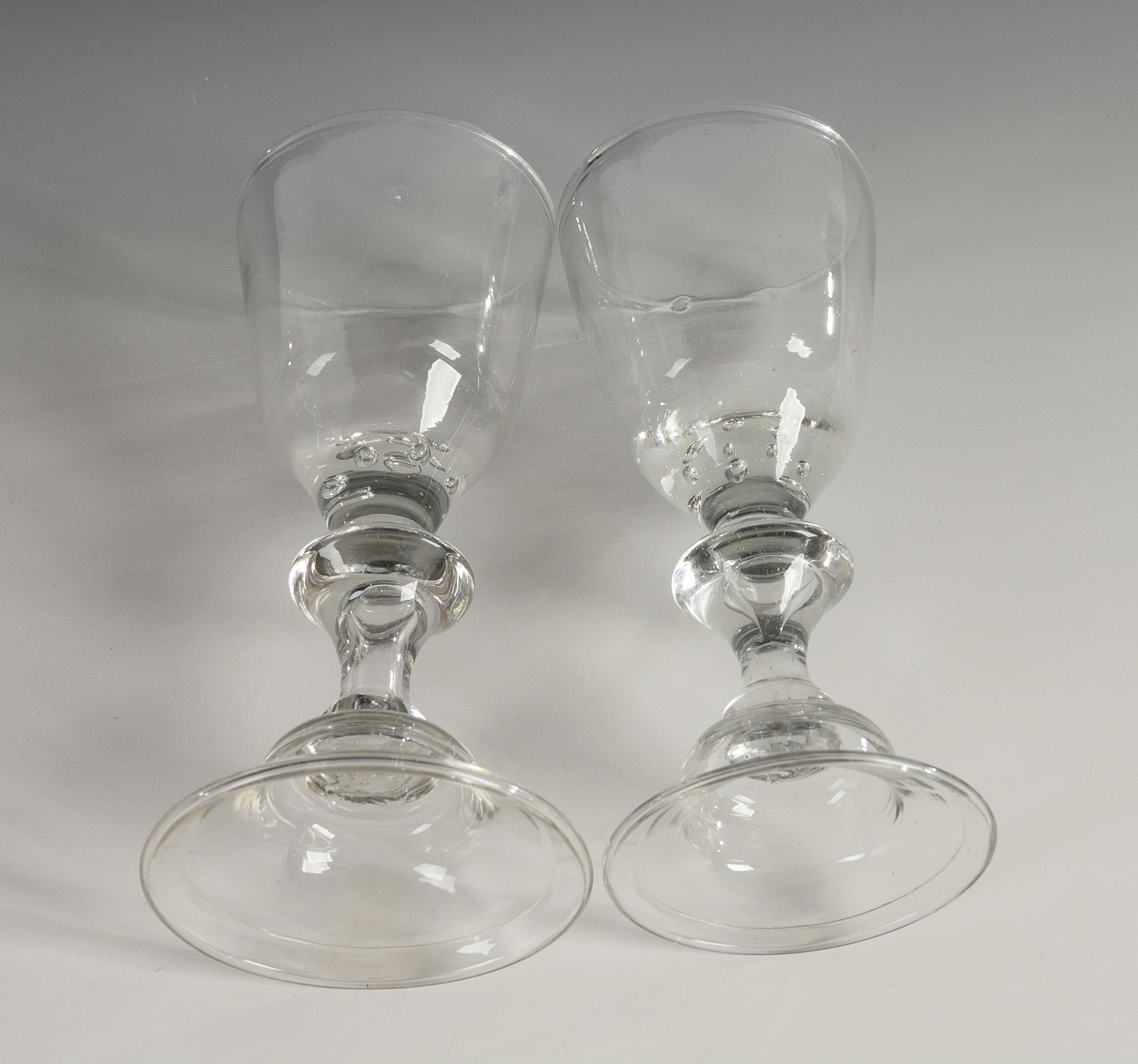 2 verschiedene Gläser mit Glockenkuppa, sieben eingestochenen Luftblasen im Kuppaboden, Balusterschaft mit eingestochener Luftblase, hutartigem Fuß und umgeschlagenem Rand; Abriss.