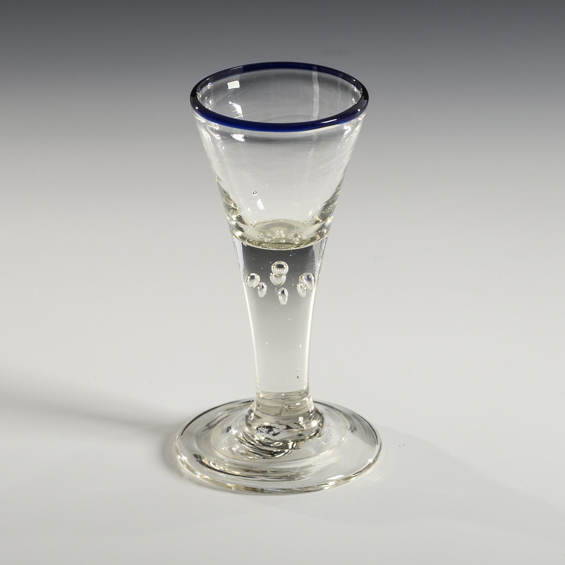 Konische, in den massiven Schaft mit sieben eingestochenen Luftblasen übergehende Kuppa, Rundfuß mit breit umgeschlagenem Rand; Abriss.
