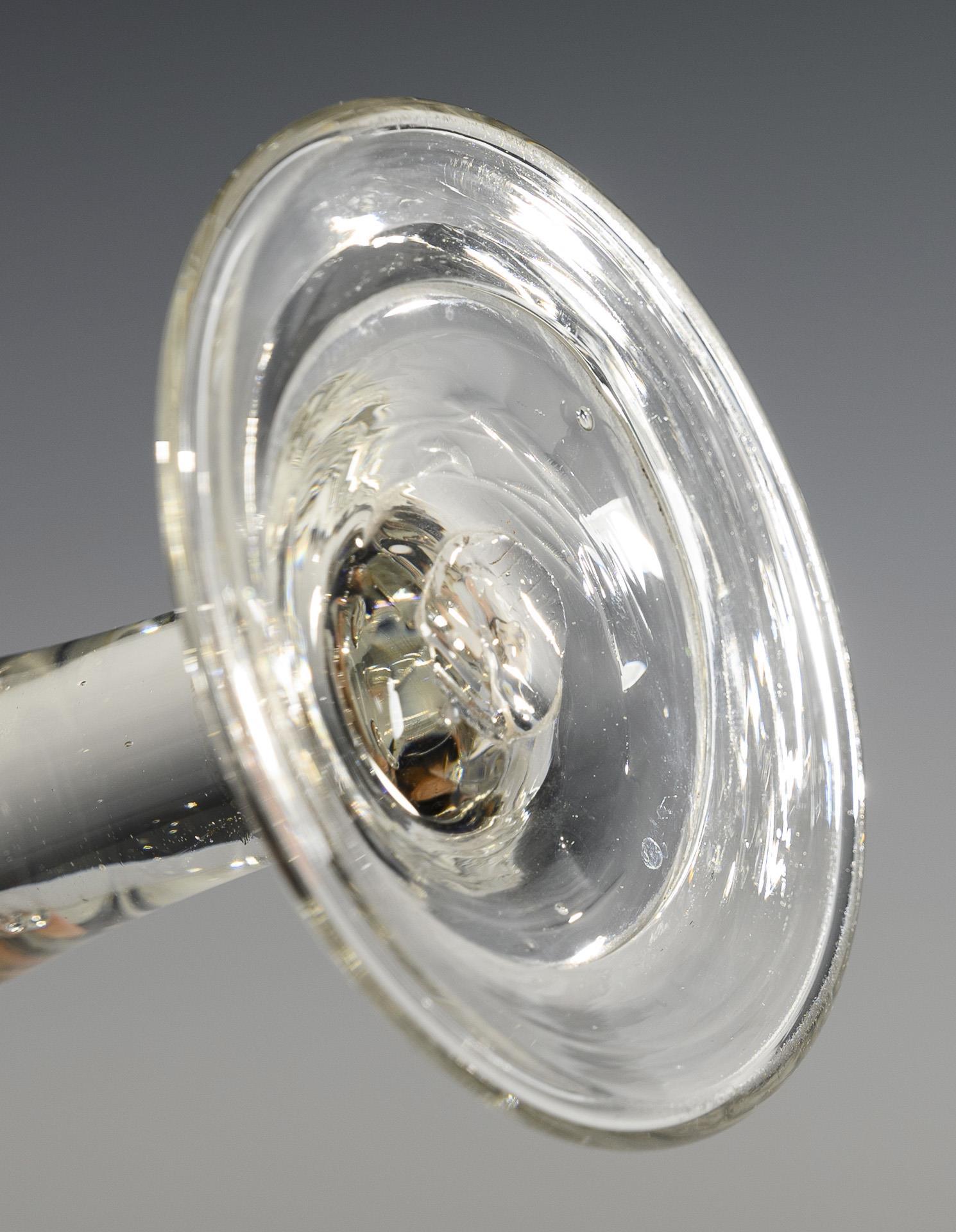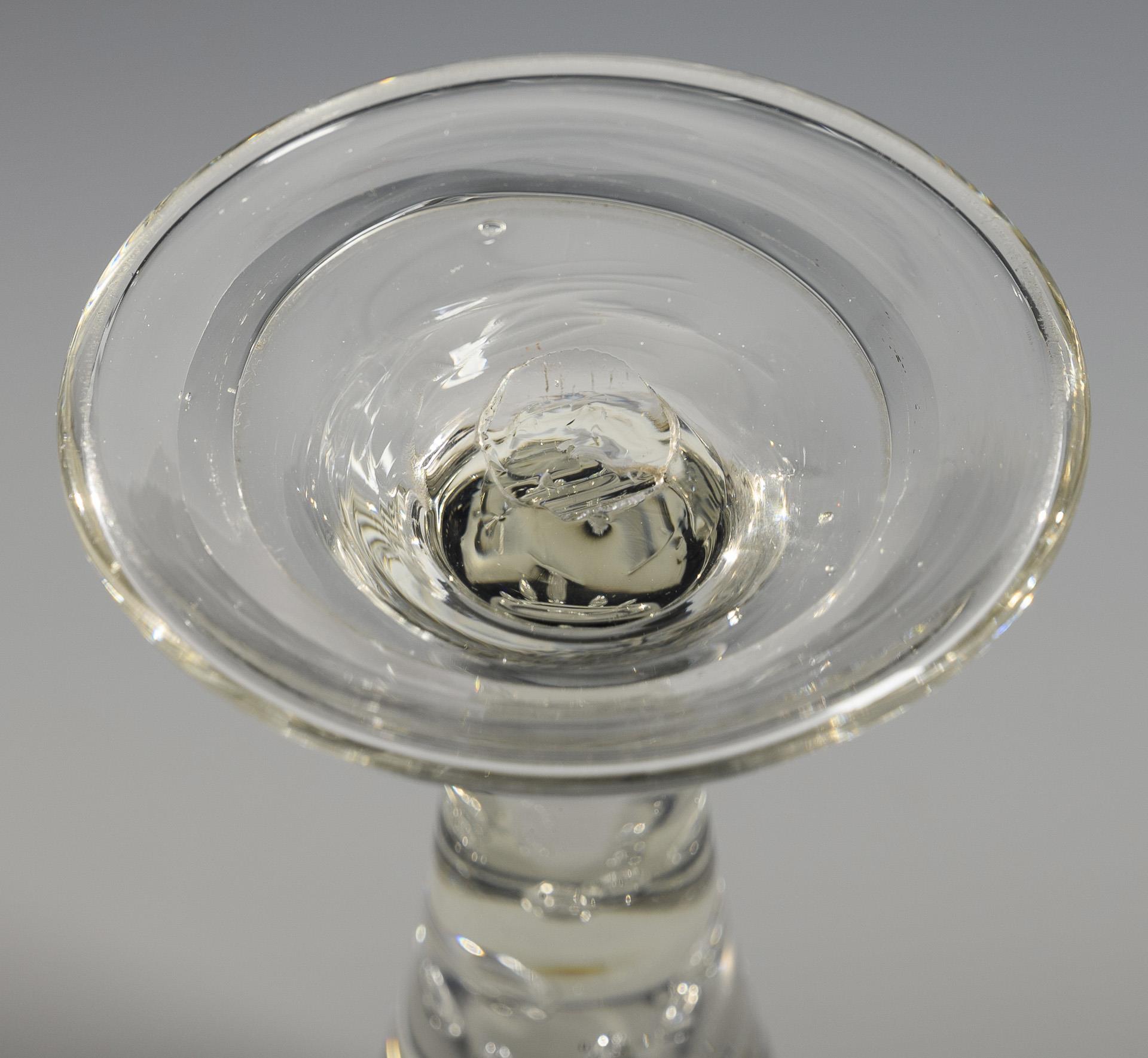 Konische, in den massiven Schaft mit sieben eingestochenen Luftblasen übergehende Kuppa, Rundfuß mit breit umgeschlagenem Rand; Abriss.