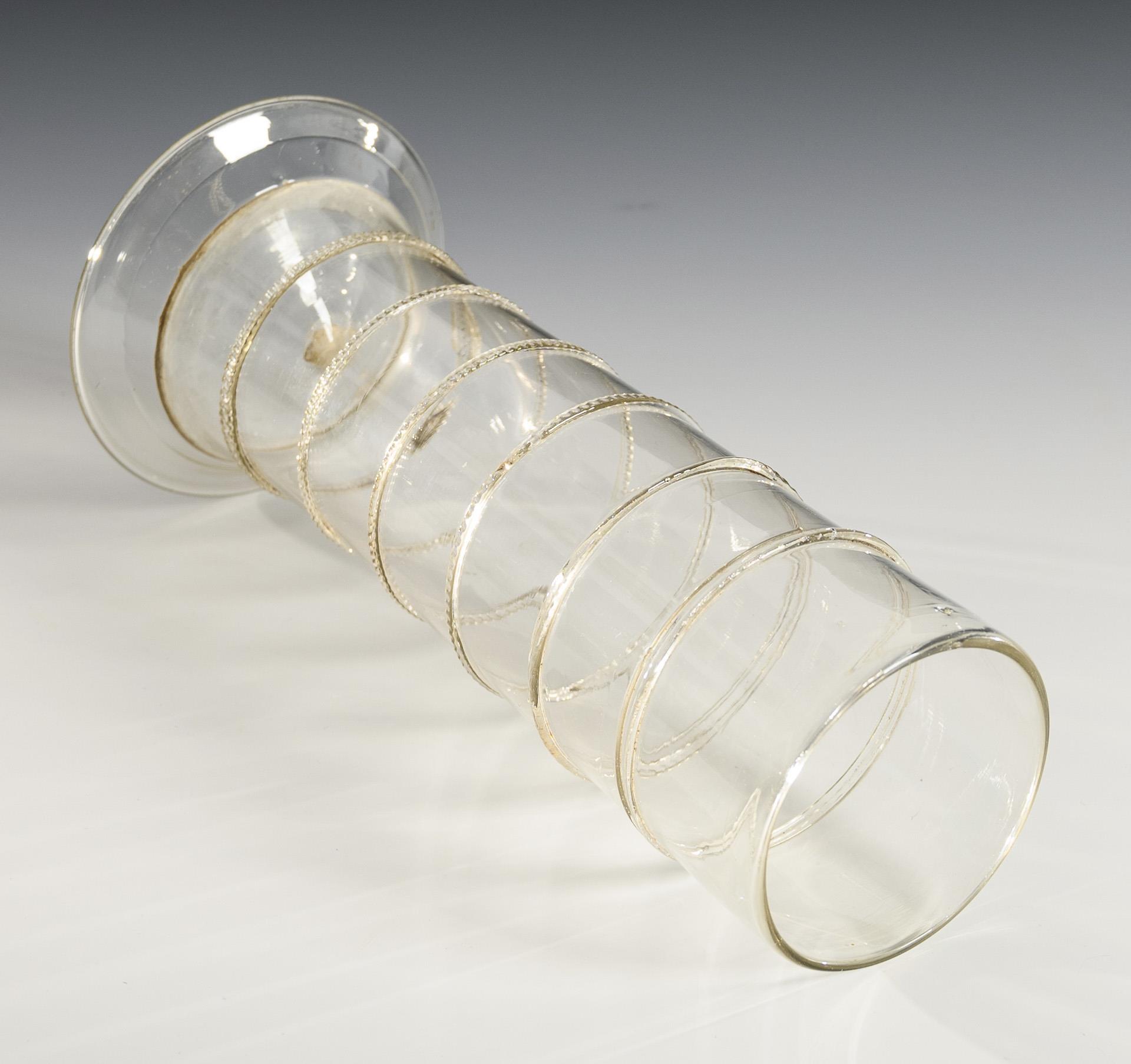 Stangenglas mit sechs aufgelegten, gekniffenen Fäden, konischer Rundfuß; Abriss.