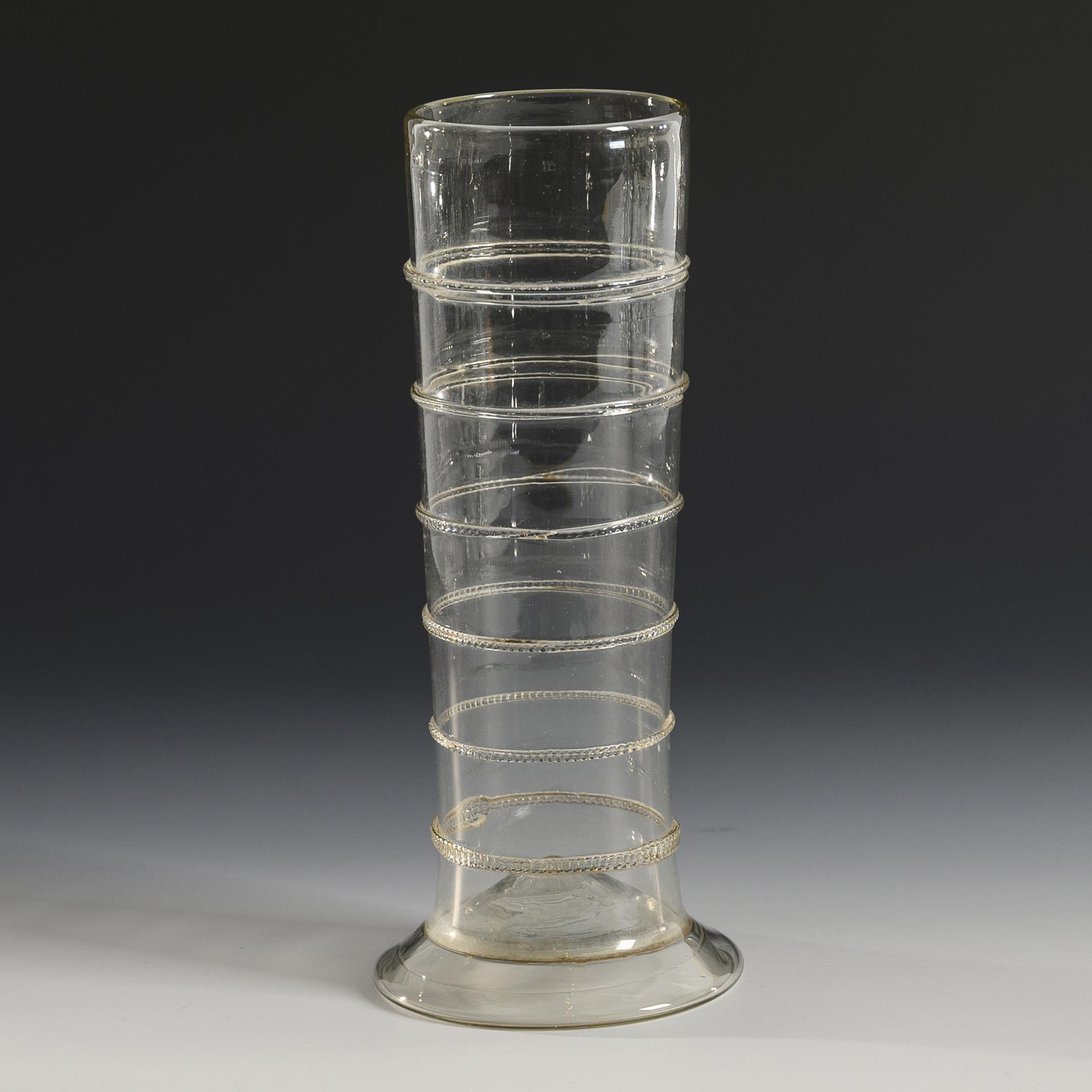 Stangenglas mit sechs aufgelegten, gekniffenen Fäden, konischer Rundfuß; Abriss.