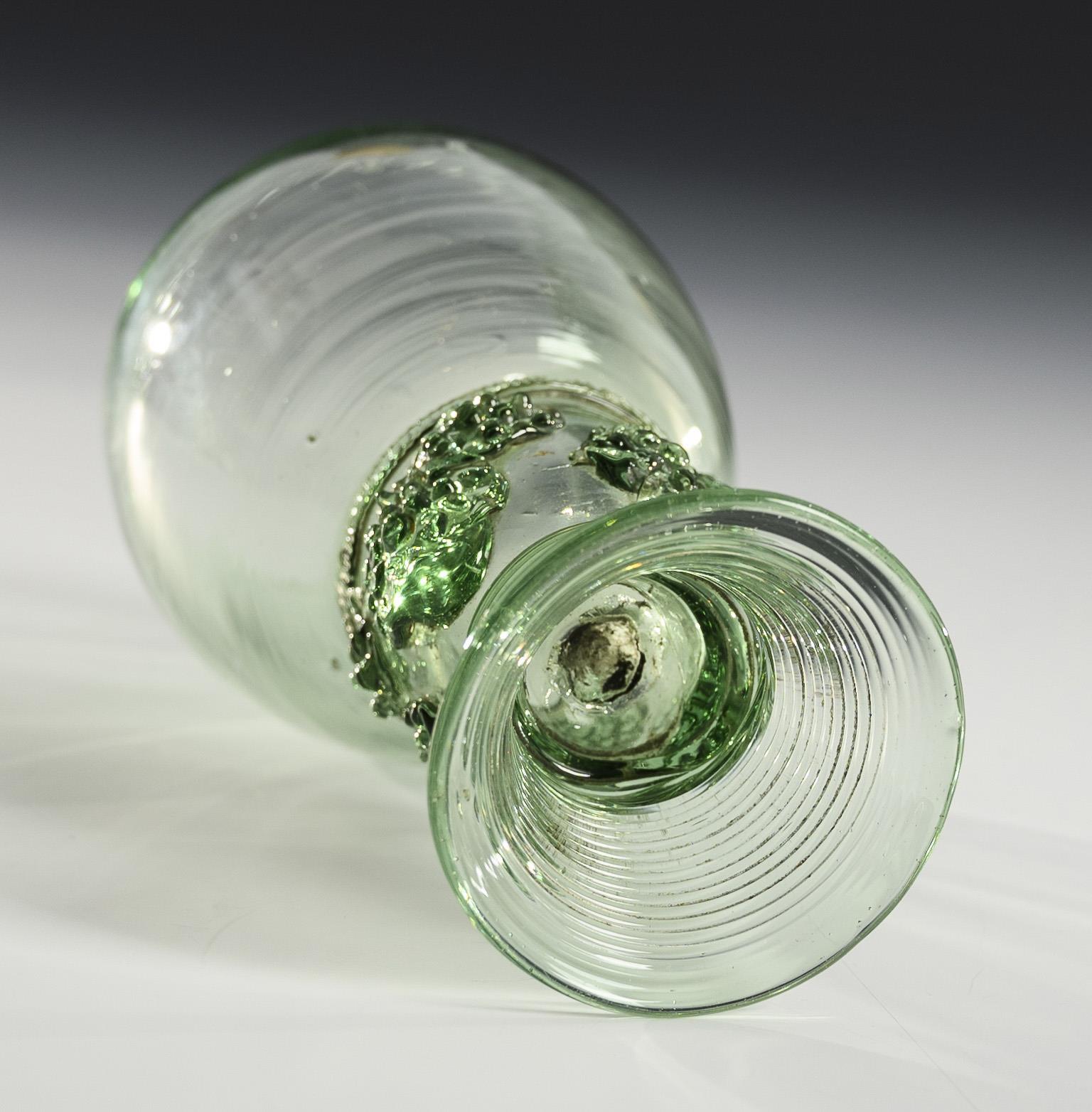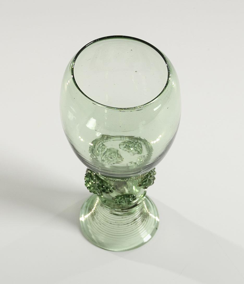 Ovoide Kuppa, zylindrischer, nach oben offener Hohlschaft mit Zwackelband und acht aufgelegten Beerennuppen, gesponnener, kleiner Tromtertenfuß; Abriss.