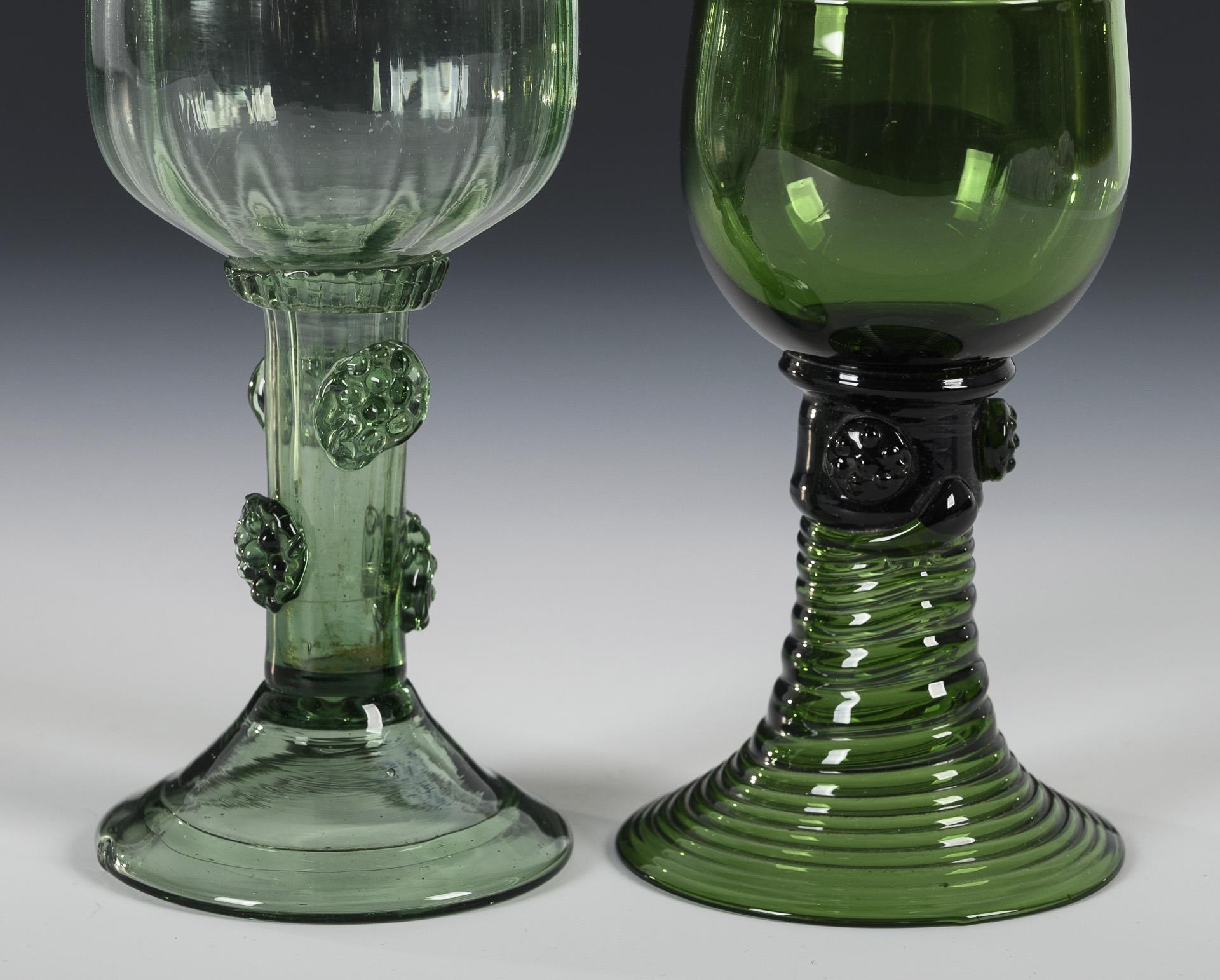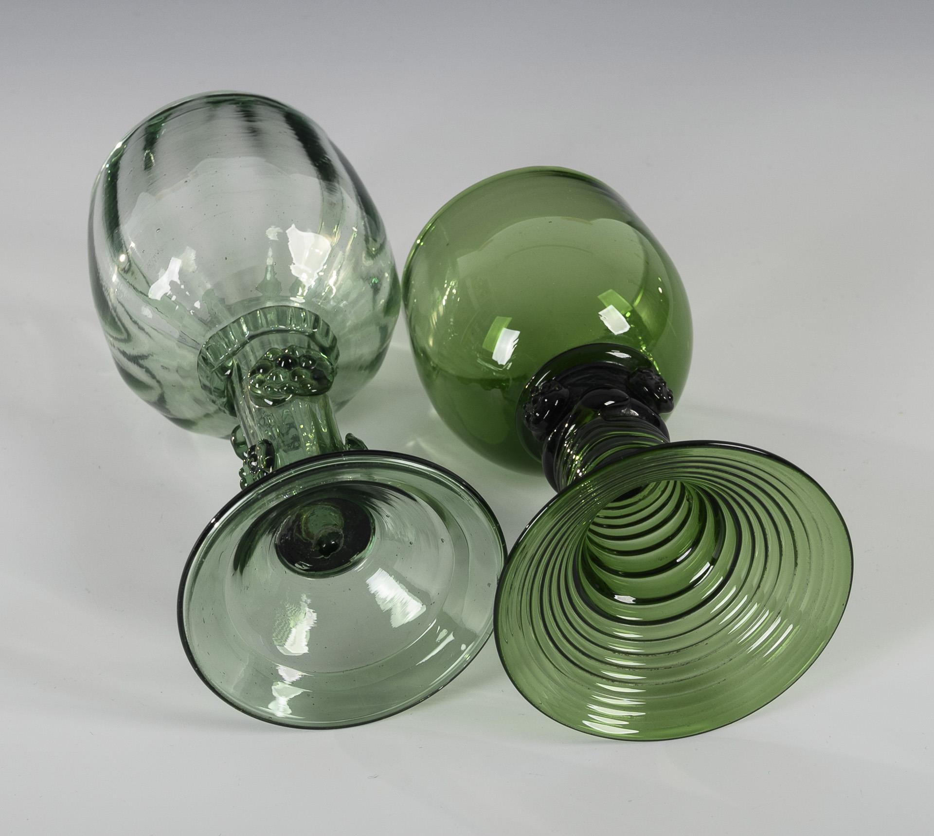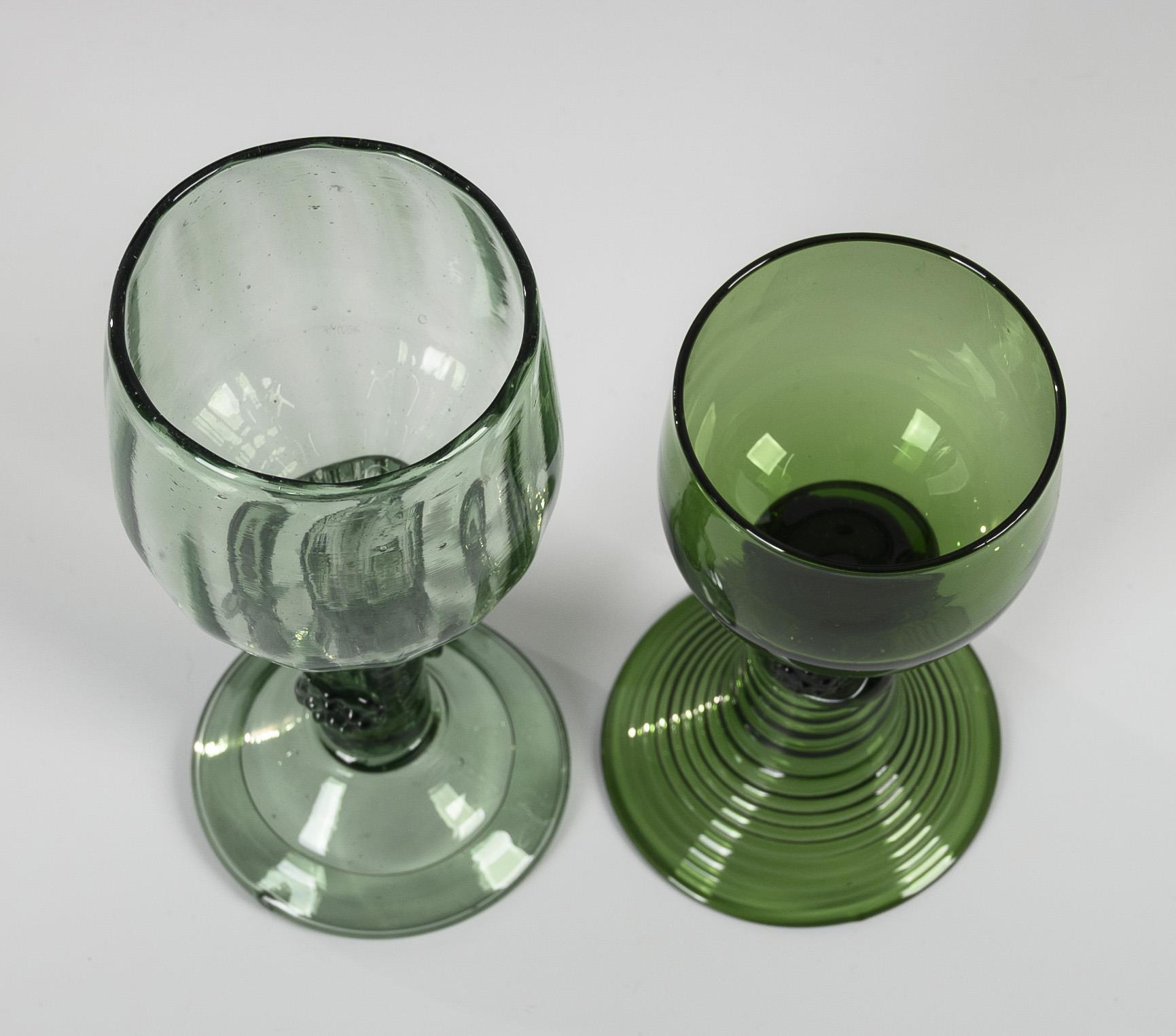 1x Anfang 19. Jh.: bauchige längsoptisch formgeblasene Kuppa, nach oben offener, gerillter Hohlschaft mit Zwackelband und vier aufgelegten Beerennuppen, ansteigender Rundfuß mit breit umgeschlagenem Rand; Abriss. / 1x 2. H. 19. Jh.: bauchige Kuppa, kurzer Zylinderhohlschaft mit vier aufgelegten Beerennuppen, gesponnener Trompetenfuß; Abriss.