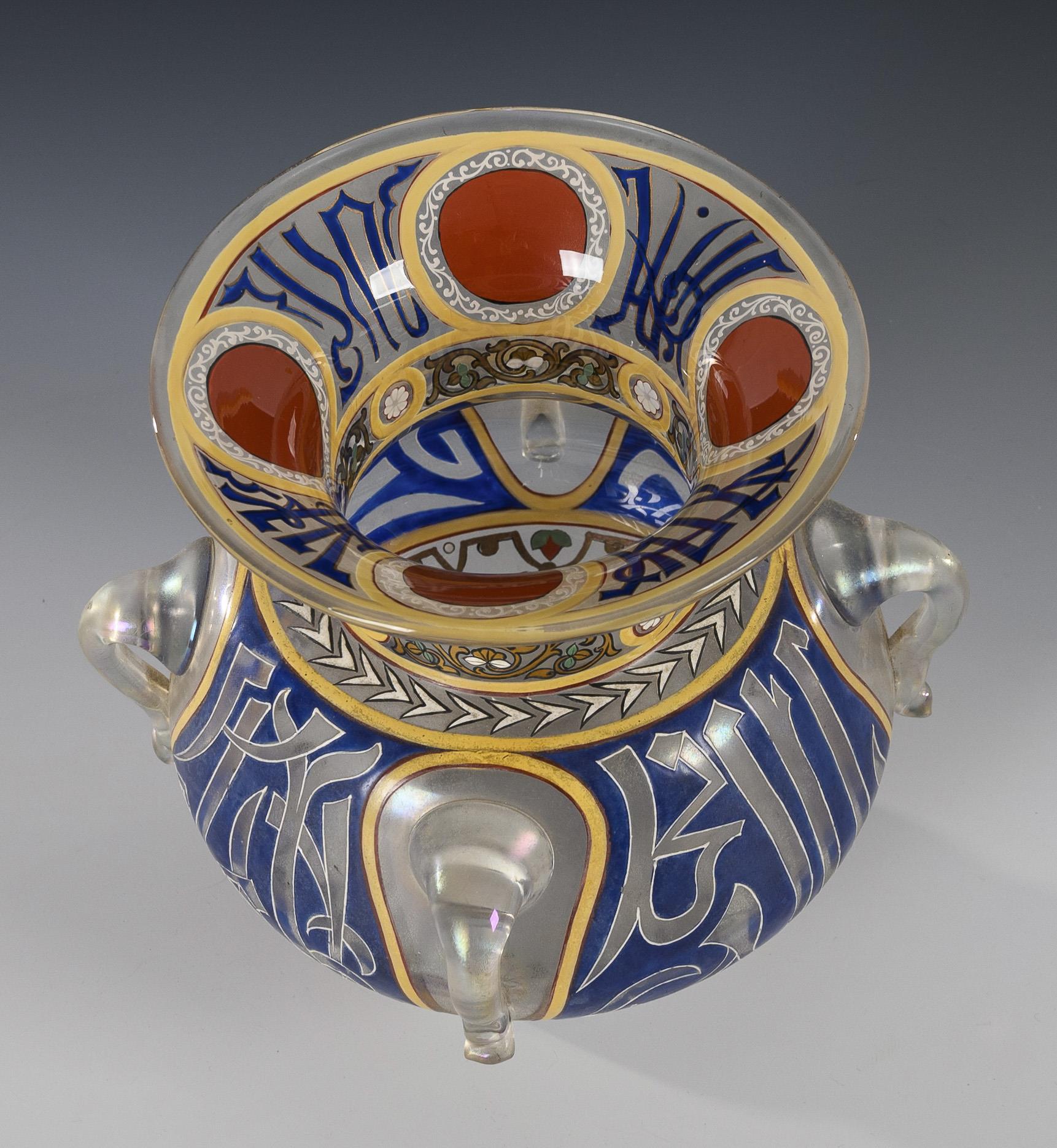 Bauchiger Korpus mit vier angeschmolzenen Ösen, Kraterhals, Rundfuß; ausgekugelter Abriss. Emailbemalt mit Schriftzeichen im arabischen Stil und Floralelementen.