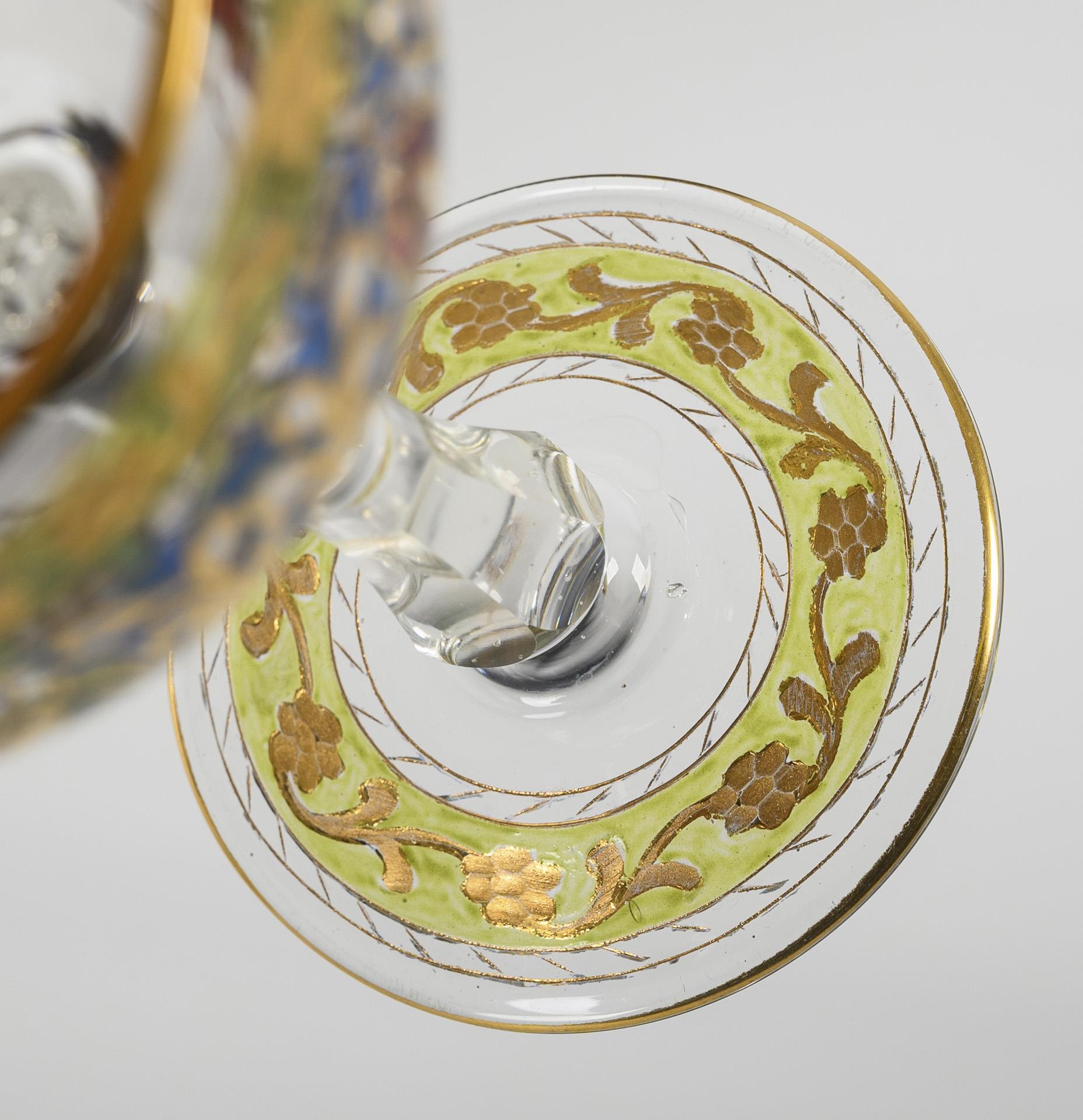 Farbloses Glas, polychrome Emailmalerei, Goldstaffage. H ca. 16 cm.