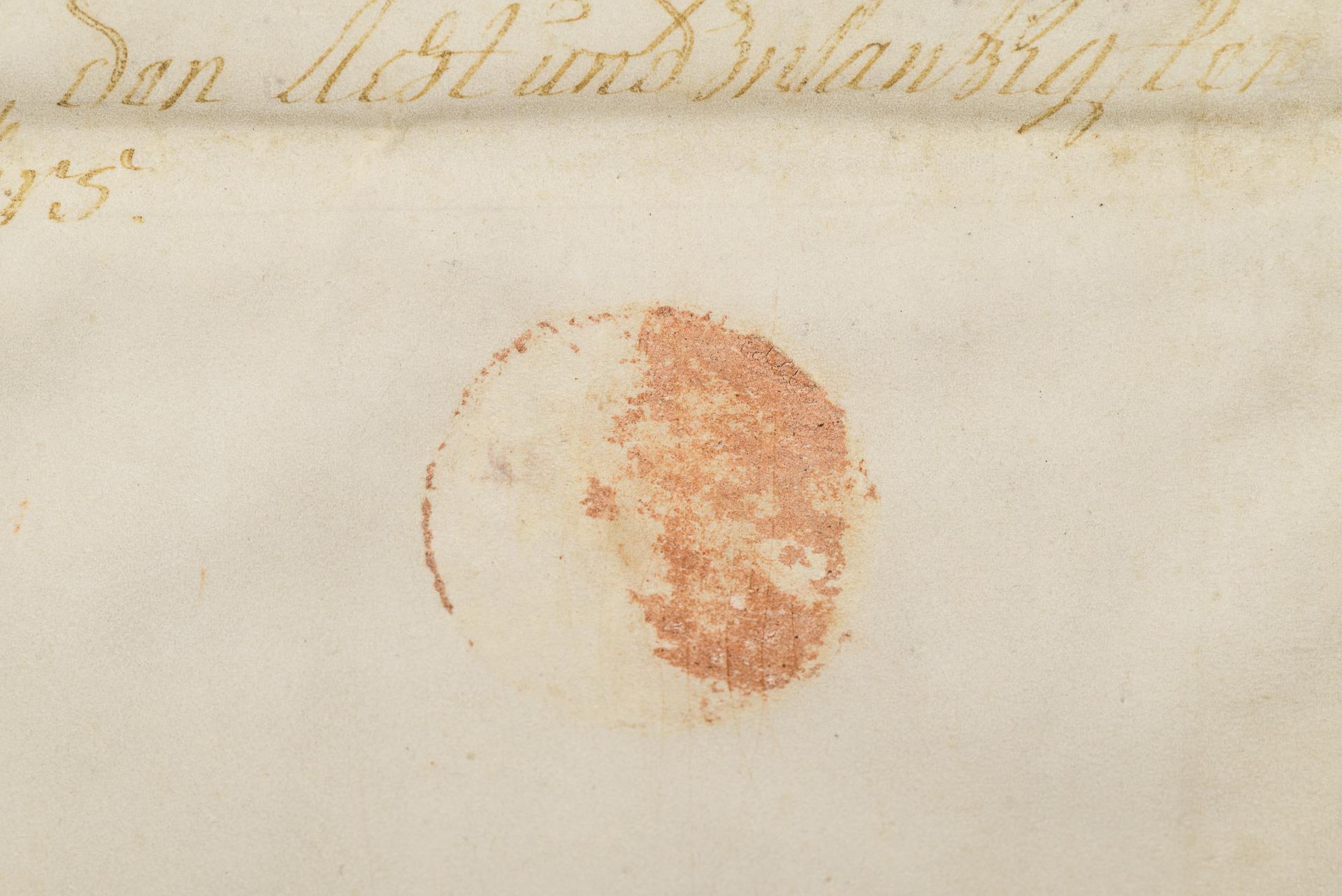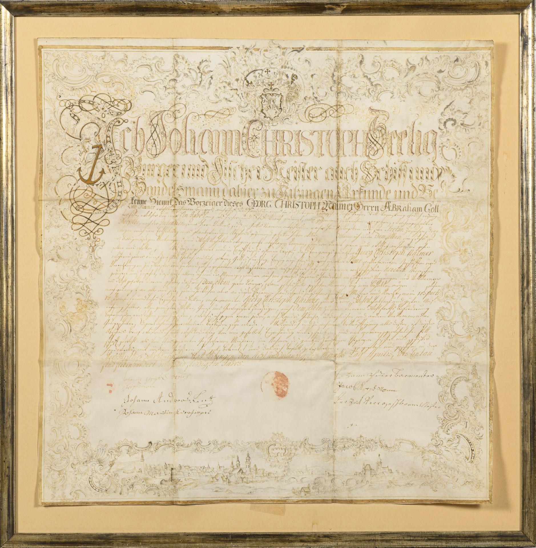 "Ich Johann Christoph Seelig, Bürger und Fischermeister auch Schiff- und Handelsmann dahier zu Kitzingen urkunde und bekenne hiermit, das Vorzeiger dieses Georg Christoph Naimer Herrn Abraham Gottlieb Raimer.... ". In lateinischer und deutscher Schrift, umrahmt von einer Rocaillenbordüre mit Vedute von Kitzingen und bekrönt vom Wappen des Adam Friedrich von Seinsheim, Bischof von Würzburg und Bamberg. Faltig, ausgeblichen, Siegel fehlt.