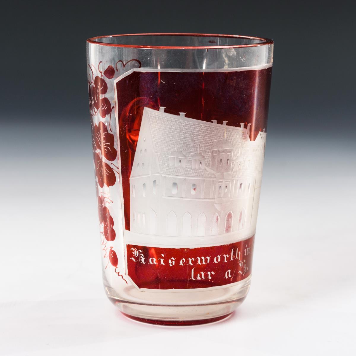 Pseudofacettierter Bierkrug mit zinnmontiertem Deckel mit über Vordruck farbig gemalter Porzellanplakette. / Konischer Bierkrug mit zinnmontiertem Deckel und geschliffenen Ansichten. / Konischer Becher mit schauseitiger Ansicht.