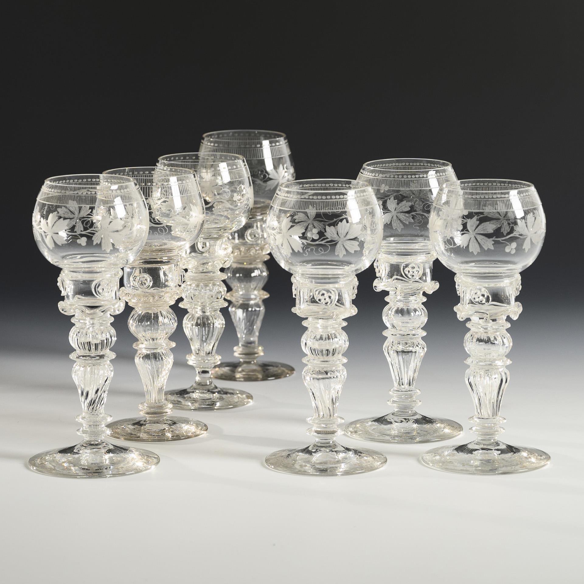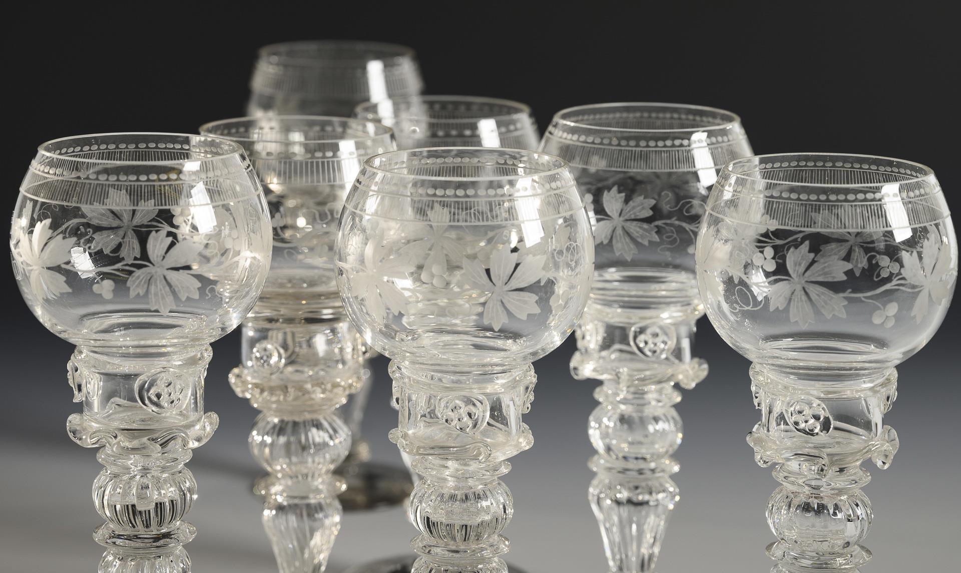 Bauchige Kuppa, mehrfach gegliederter Hohlschaft mit aufgelegten Beerennuppen und Wellenband, Rundfuß. Auf der Kuppa unter einer ornamentalen Bordüre ein graviertes Weinlaubband. H 19-20 cm.
