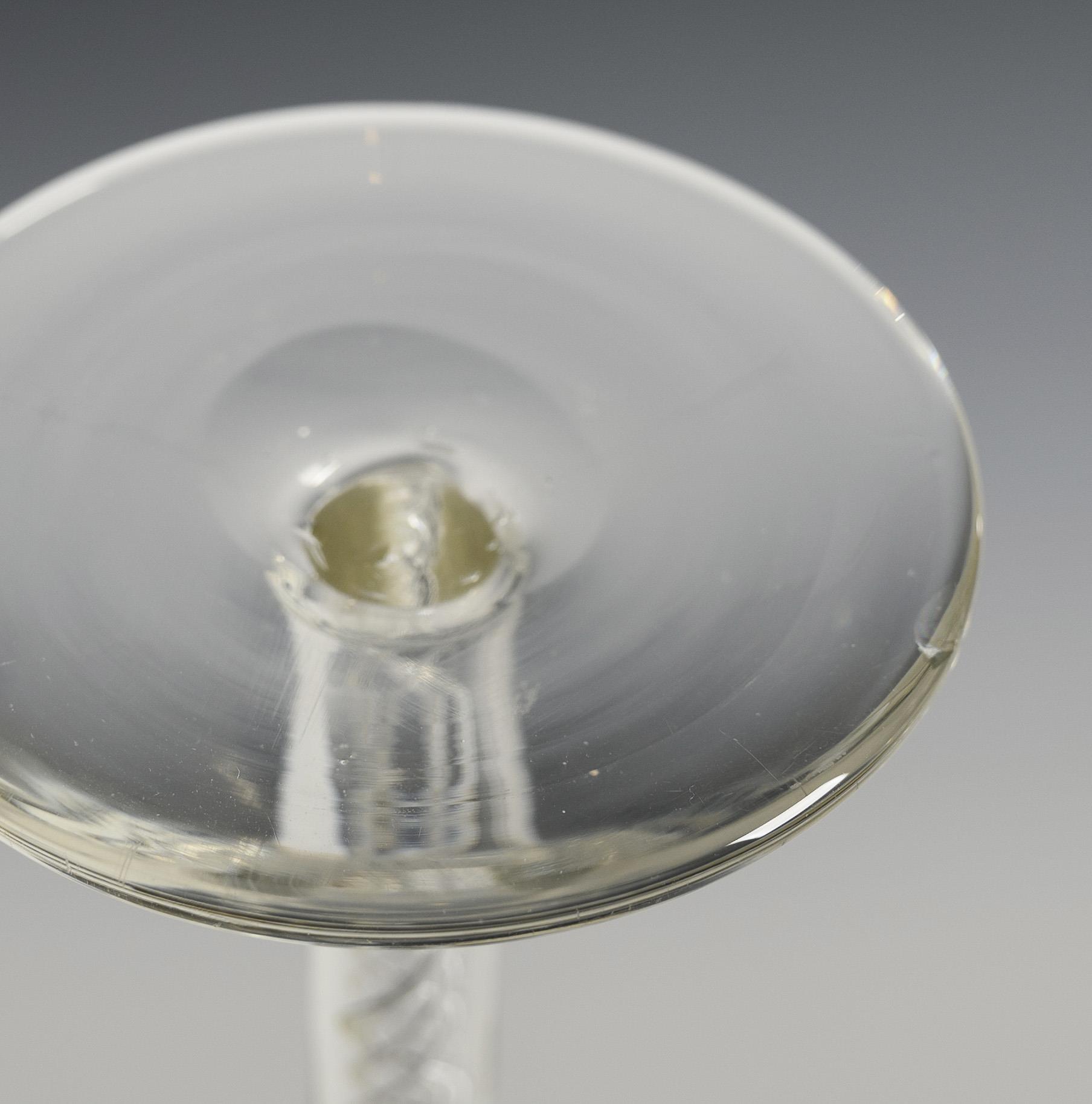 Am Ansatz wabenfacettierte konische Kuppa, sehr hoher Stängel mit eingeschlossenen Luftspiralen, Rundfuß; Abriss bzw. ausgekugelter Abriss. 2x minimaler, nicht durchgehender, kurzer Spannungsriss am Fußrand, 1x minimale Bestoßung am Fußrand.
