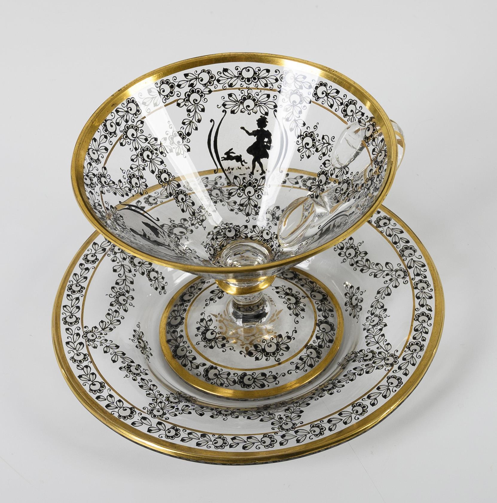 Farbloses Glas, Schwarzlotmalerei, Goldstaffage. Tasse (H 7,5 cm), Untertasse (Ø 12,5 cm).