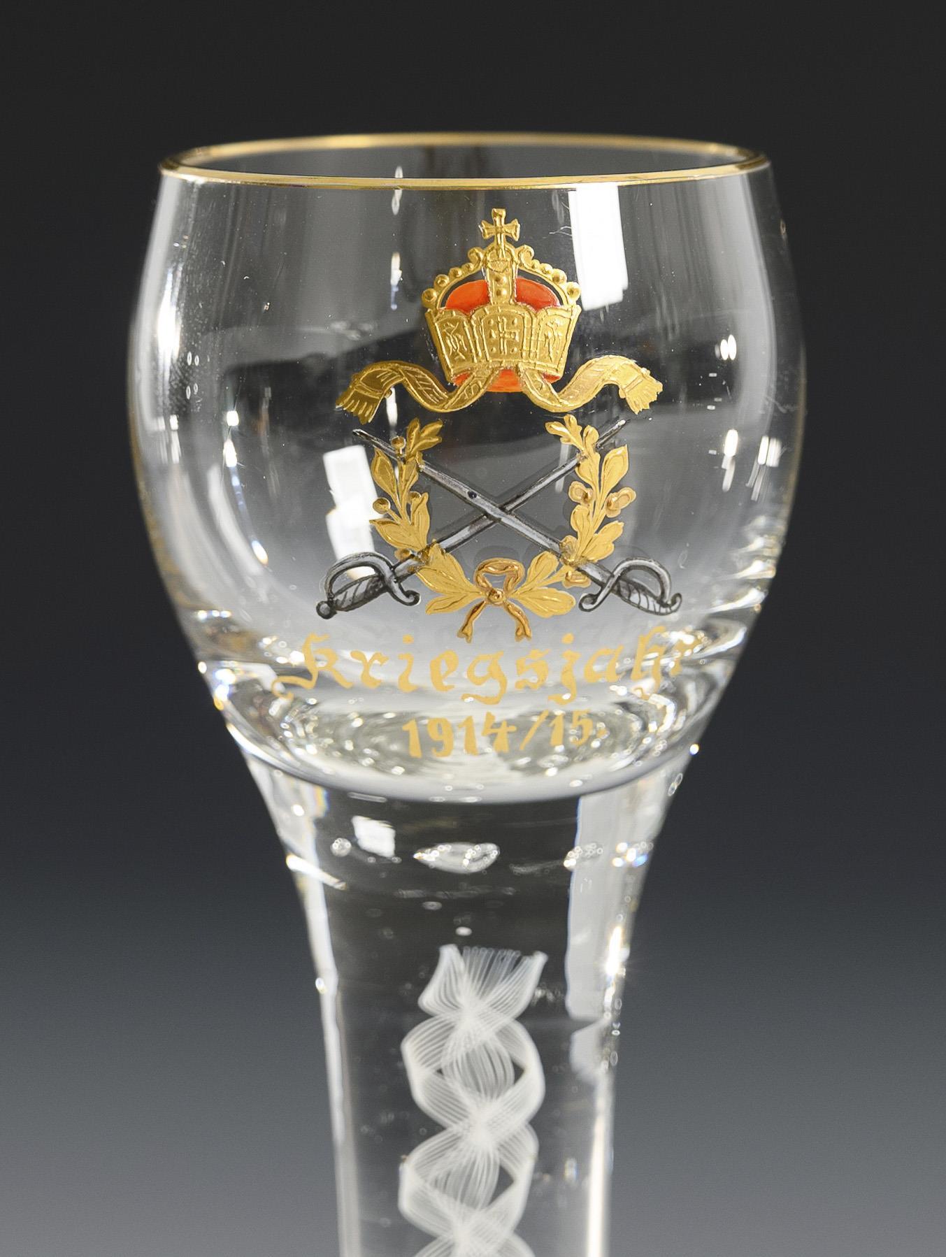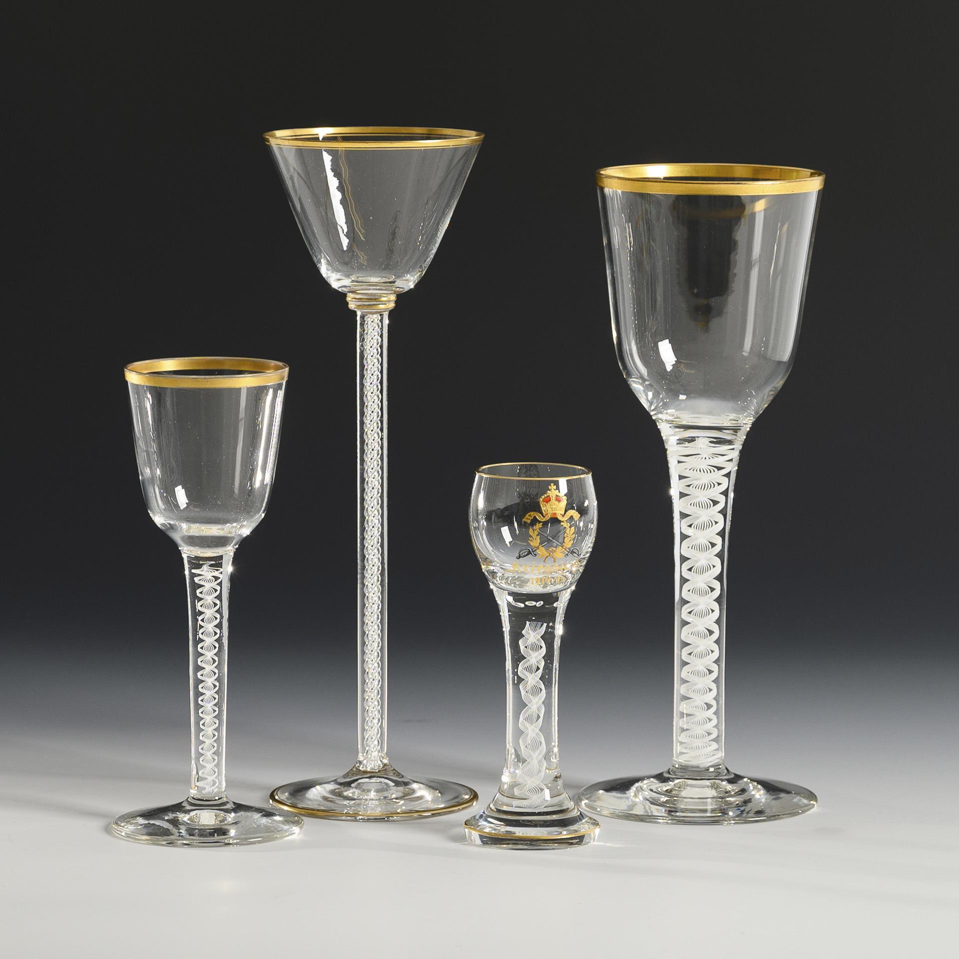 3 Kelchgläser aus farblosem Glas mit weißem Spiralfaden im hohen Stängel, Rundfuß, Goldrand (H 19, 26,5 und 28 cm). / 1 Likörglas mit weißem Spiralfaden und der schauseitigen Reliefgold- und Emailmalerei eines Lorbeerkranzes mit gekreuzten Schwertern unter der Kaiserkrone und der Bezeichnung "Kriegsjahr 1914/15"; unterseitig Goldmarke der Josephinenhütte (H 15,5 cm). Partiell minimaler Goldabrieb.