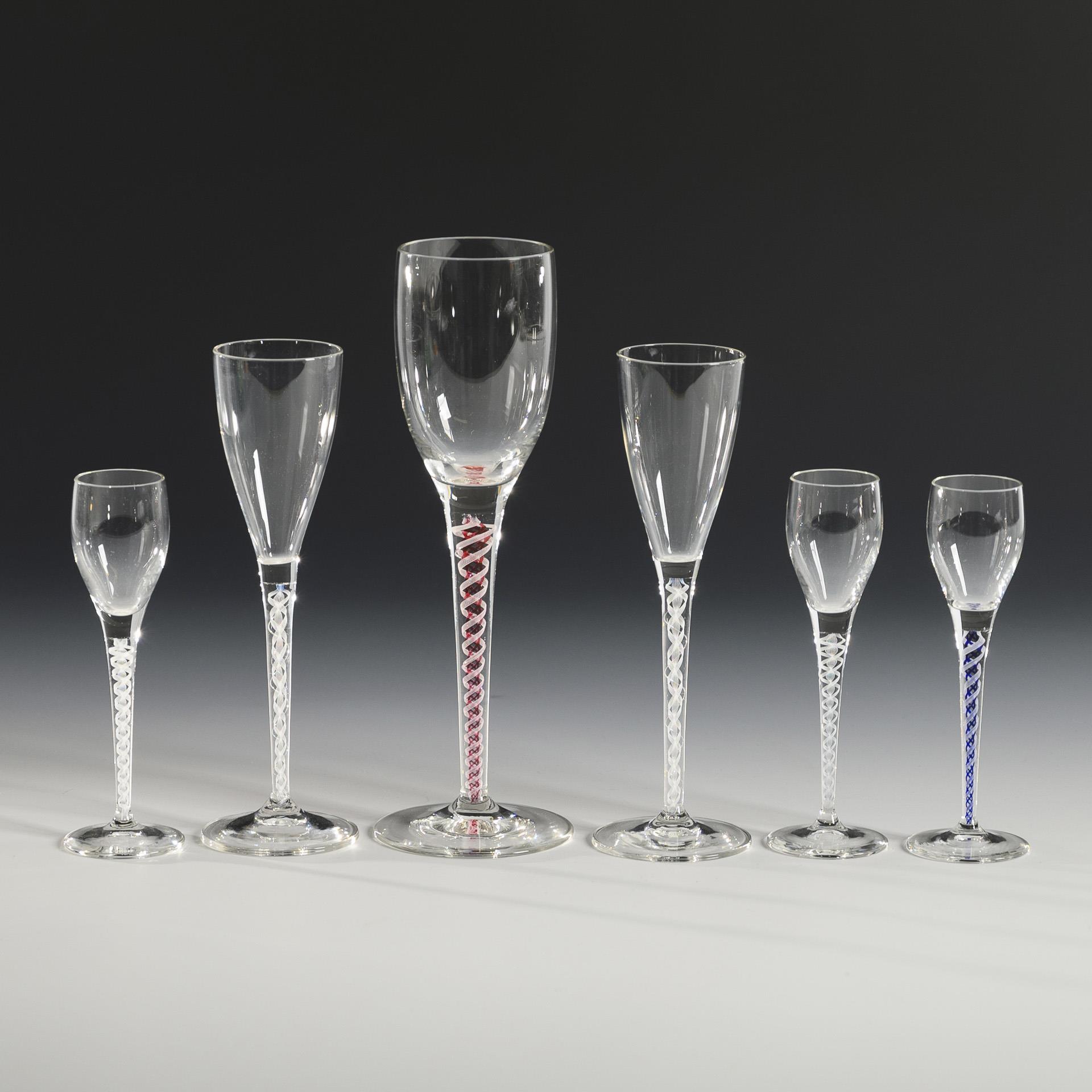 Farbloses Glas, Spiralfäden in Weiß, Rot und Blau. H 3x 15 cm, 2x 20 cm und 1x 24 cm.