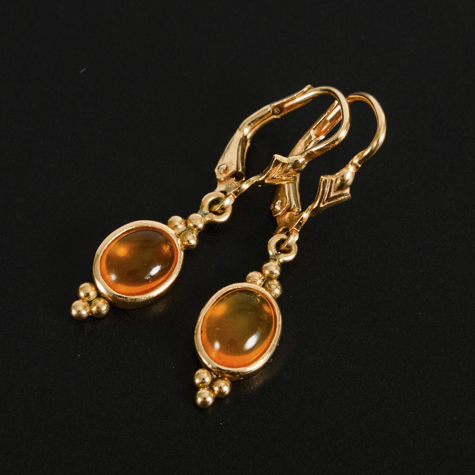 Elegantes Ohrhängerpaar mit zargengefassten Feueropal-Cabochons.