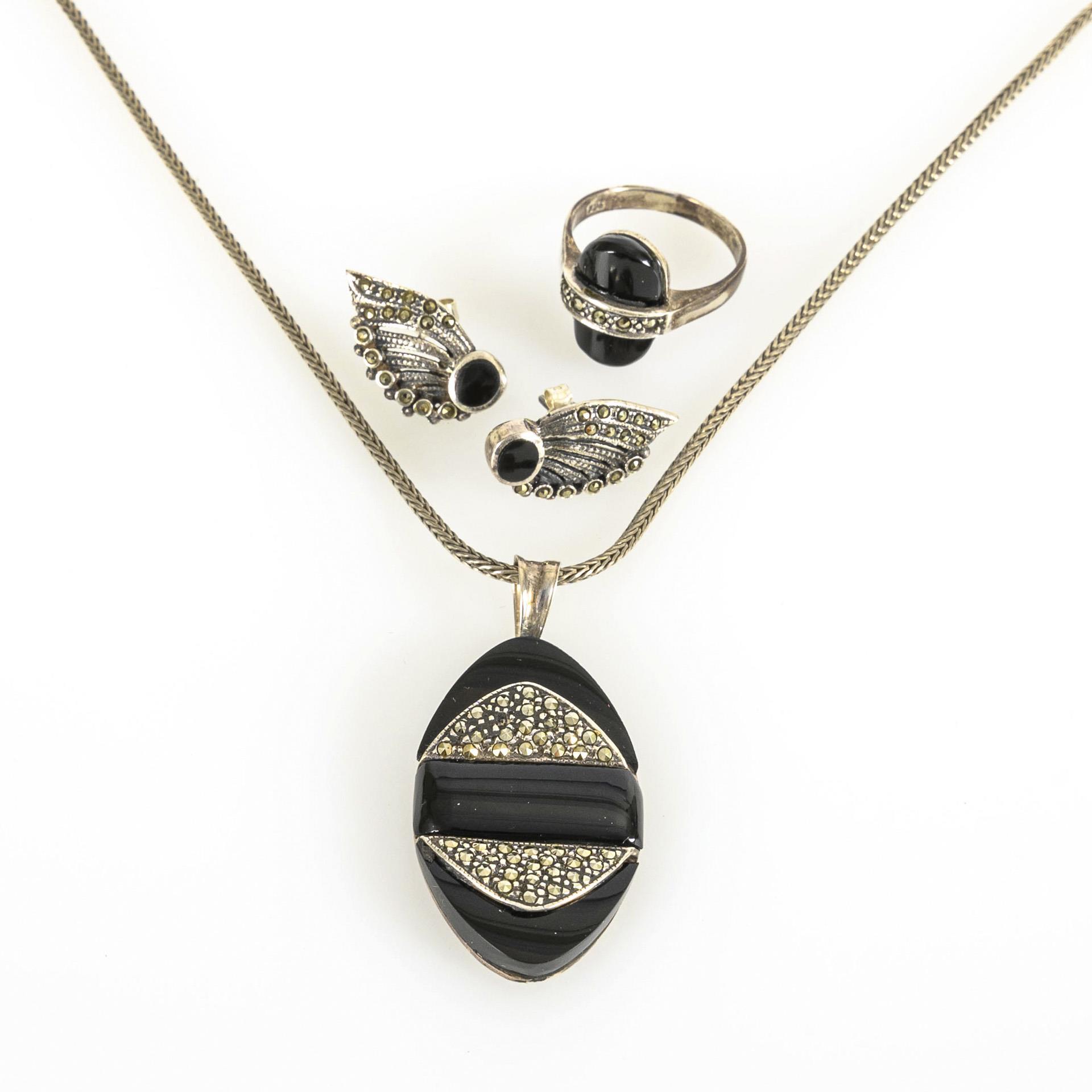 Konvolut aus drei zueinander passenden Schmuckteilen mit Onyx und Markasiten in Silber. 1 Steckmechnik lose.