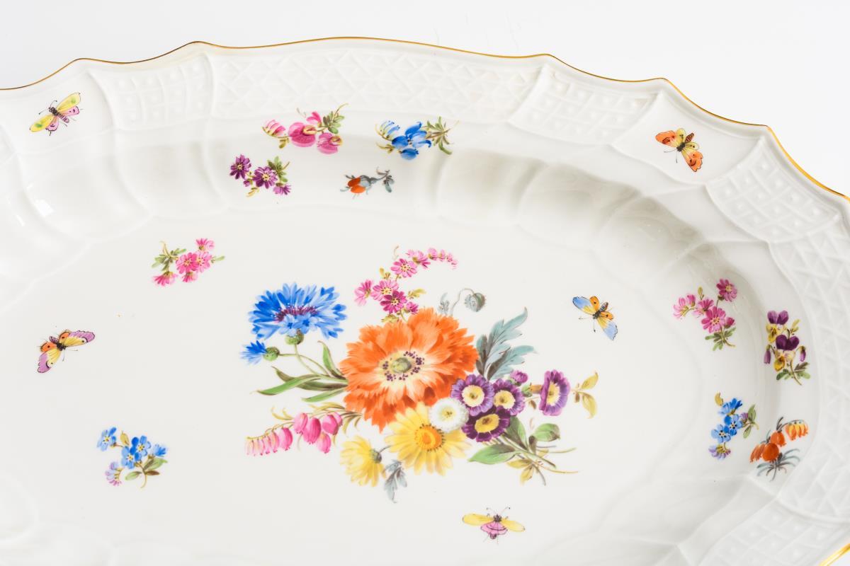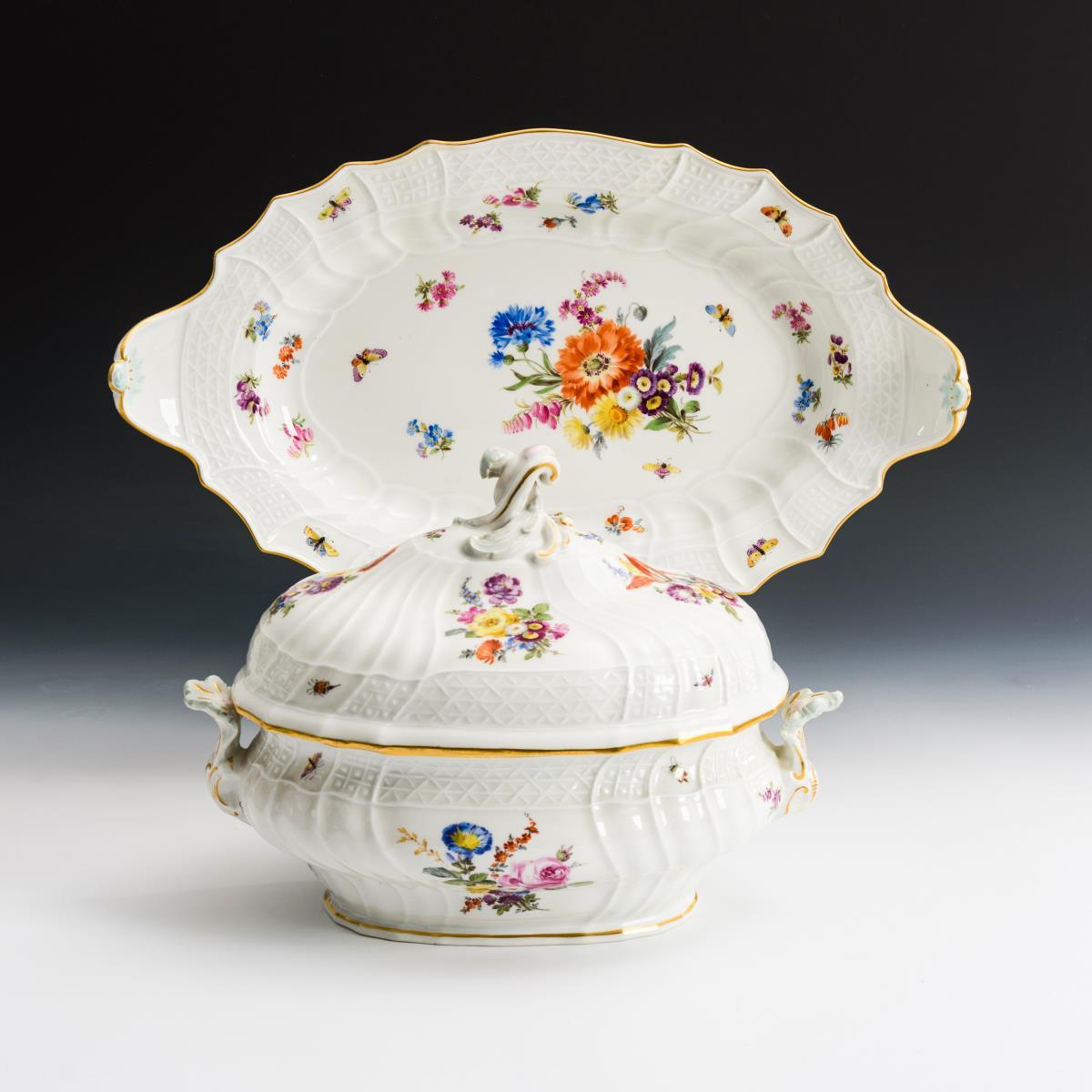 Form "Neubrandenstein". Mit Blumen- und Insektenmalerei. Terrine (H 26 cm) und Presentoir (L 51 cm). Presentoir mit Randrestaurierung.