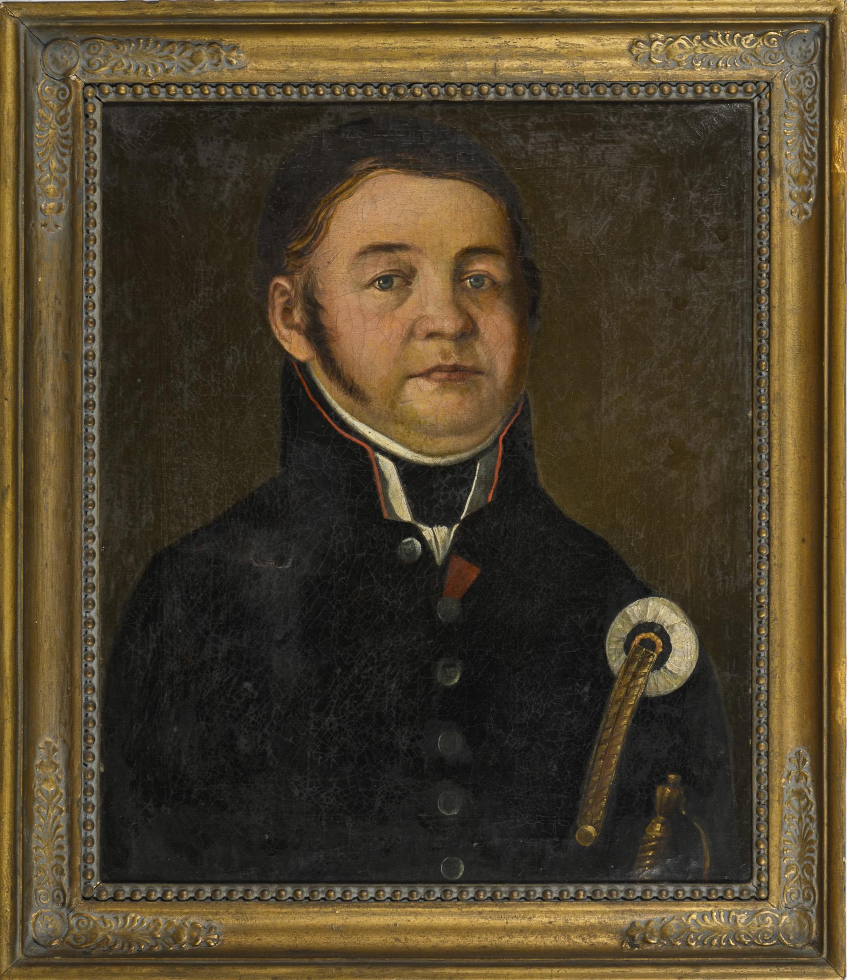 Porträt eines Mannes in dunkler Uniform mit sichtbarem Degenknauf, vor neutralem Hintergrund. Altersspuren.