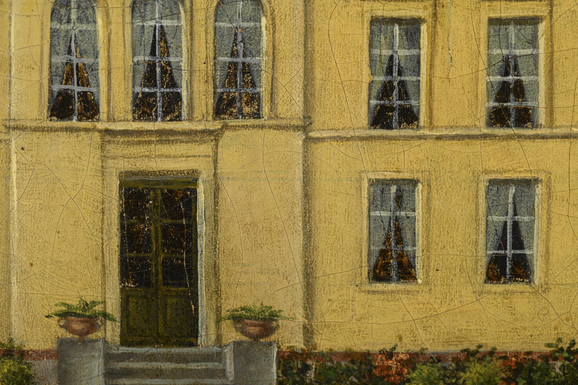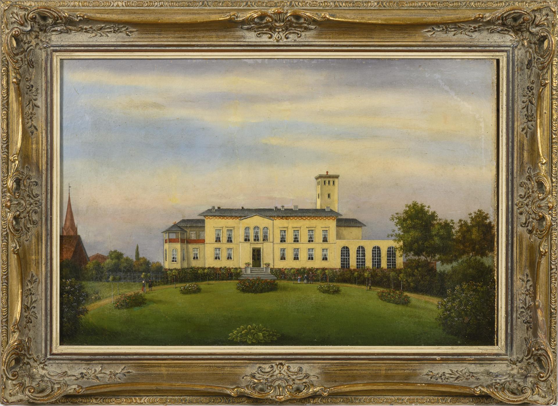 Das große Gutshaus mit dem gepflegten Park davor unter leicht wolkigem Himmel. Leinwand wachsdoubliert.
