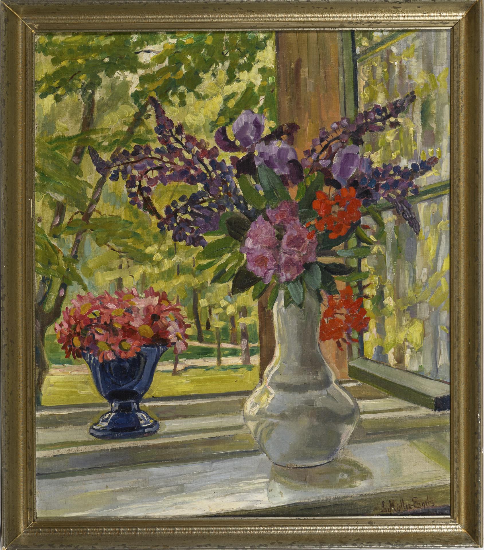 Zwei Blumensträuße in weißer und blauer Vase an einem geöffneten Fenster mit Blick auf den Park.