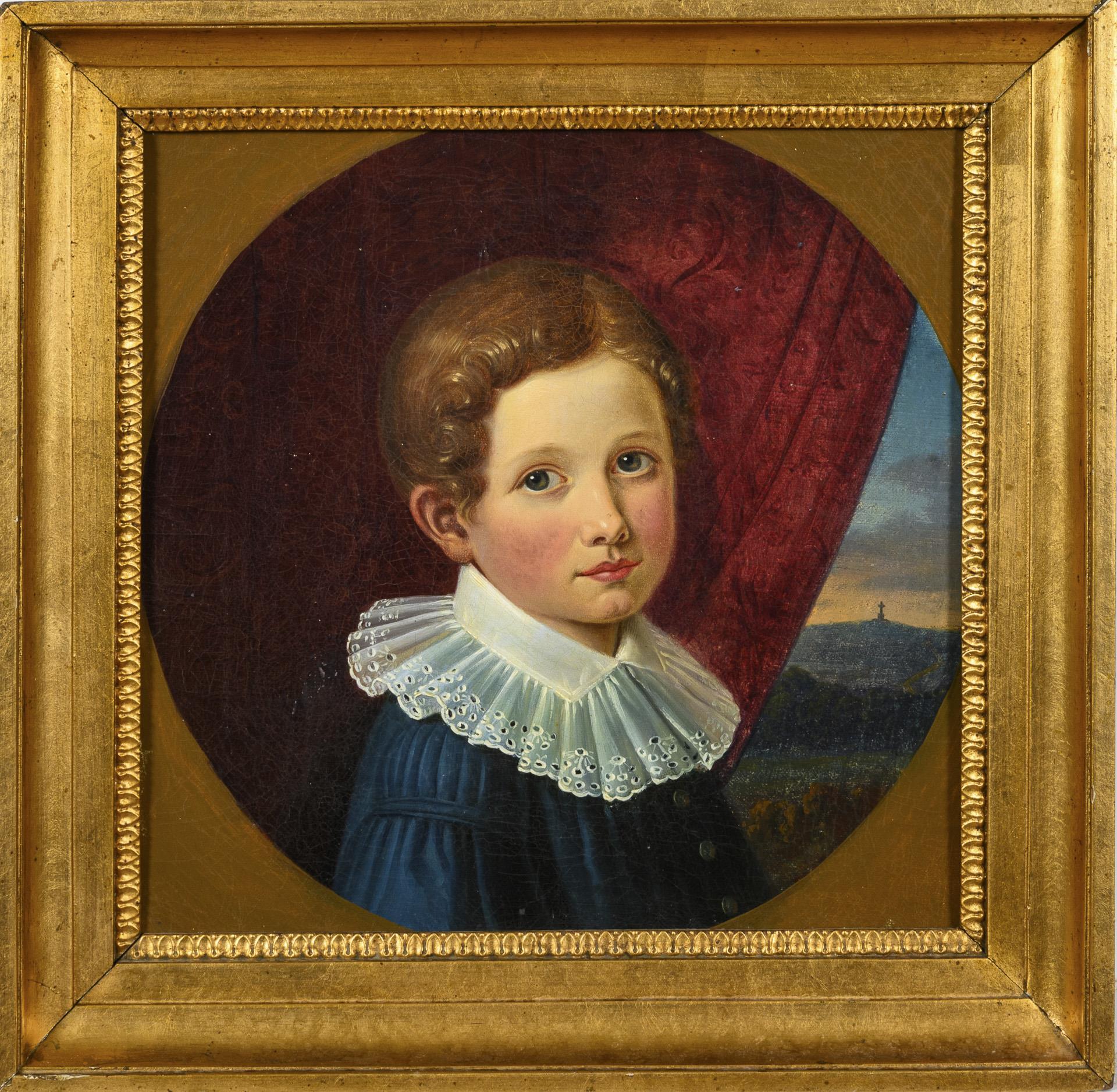 Porträt eines Jungen in dunkelblauer Kleidung mit weißem Kragen vor einem roten Vorhang, der den Blick auf eine Landschaft mit Bergkreuz freigibt. Leichte Altersspuren.