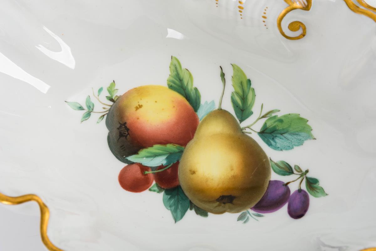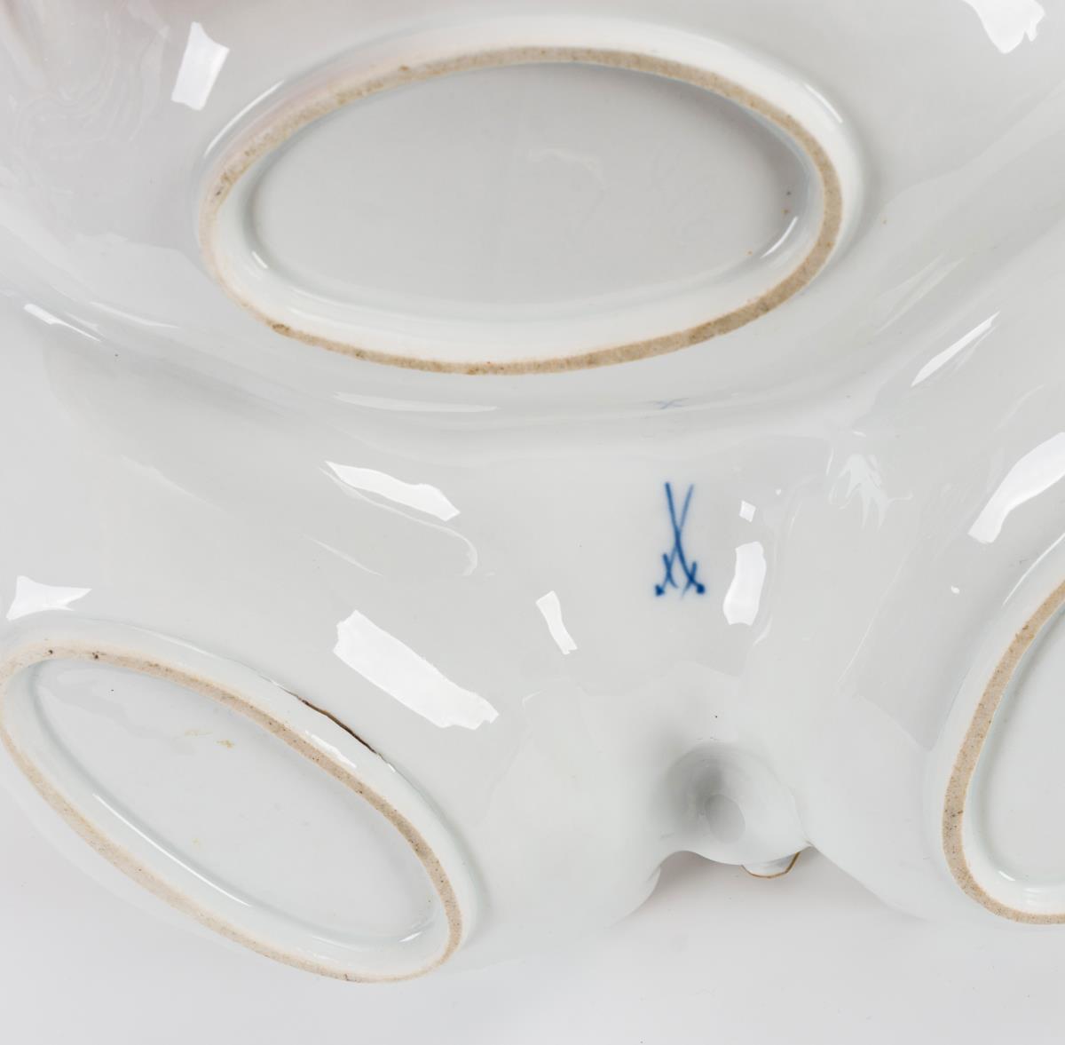 Dreiteilige Muschelschale mit Fruchtbuketts im Spiegel. Unterseitig ein kleiner Brandriss.