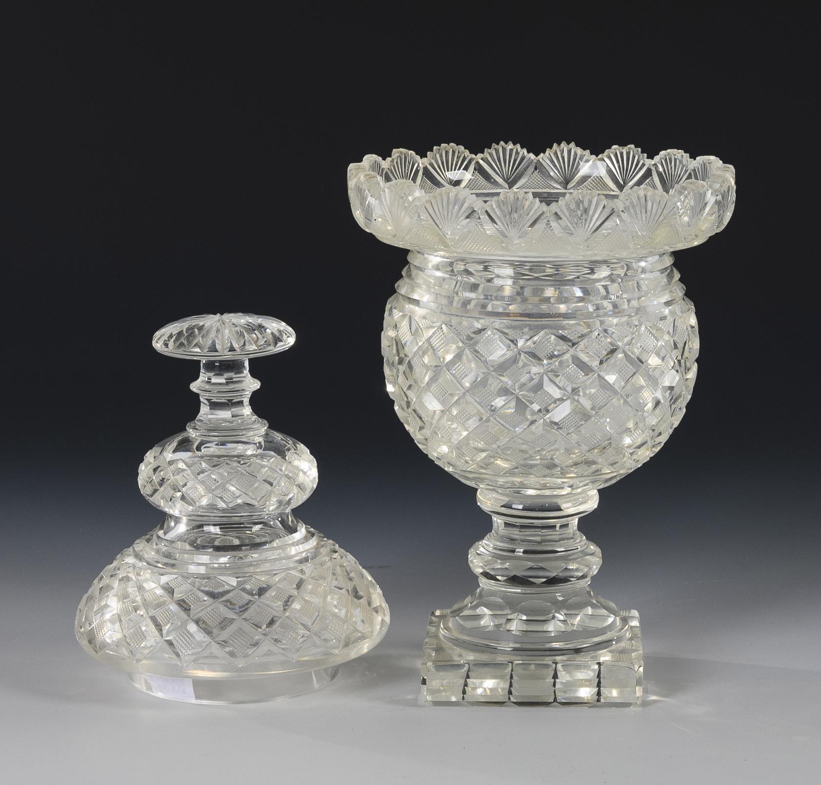 Bauchiger Korpus, hoher Knaufdeckel, mehrfach gegliederter Schaft, Rundfuß, auf Quadratplinthe. Allseitig Kerb- und Steinelschliff. 4 Bestoßungen am Korpusrand.