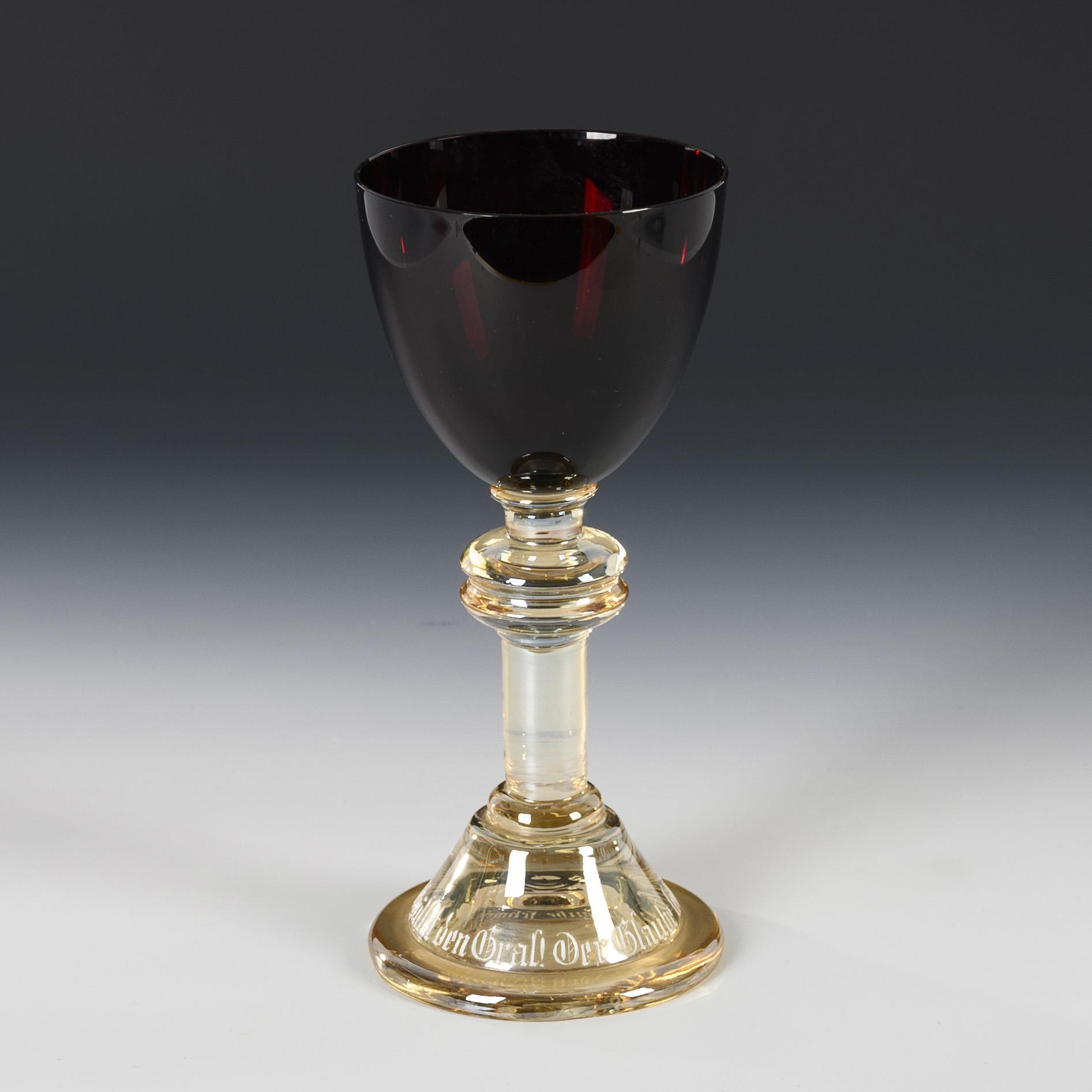 Farbloses Glas mit rubinrotem Innenfang an der Kuppa, teils lüstriert. H 25 cm.