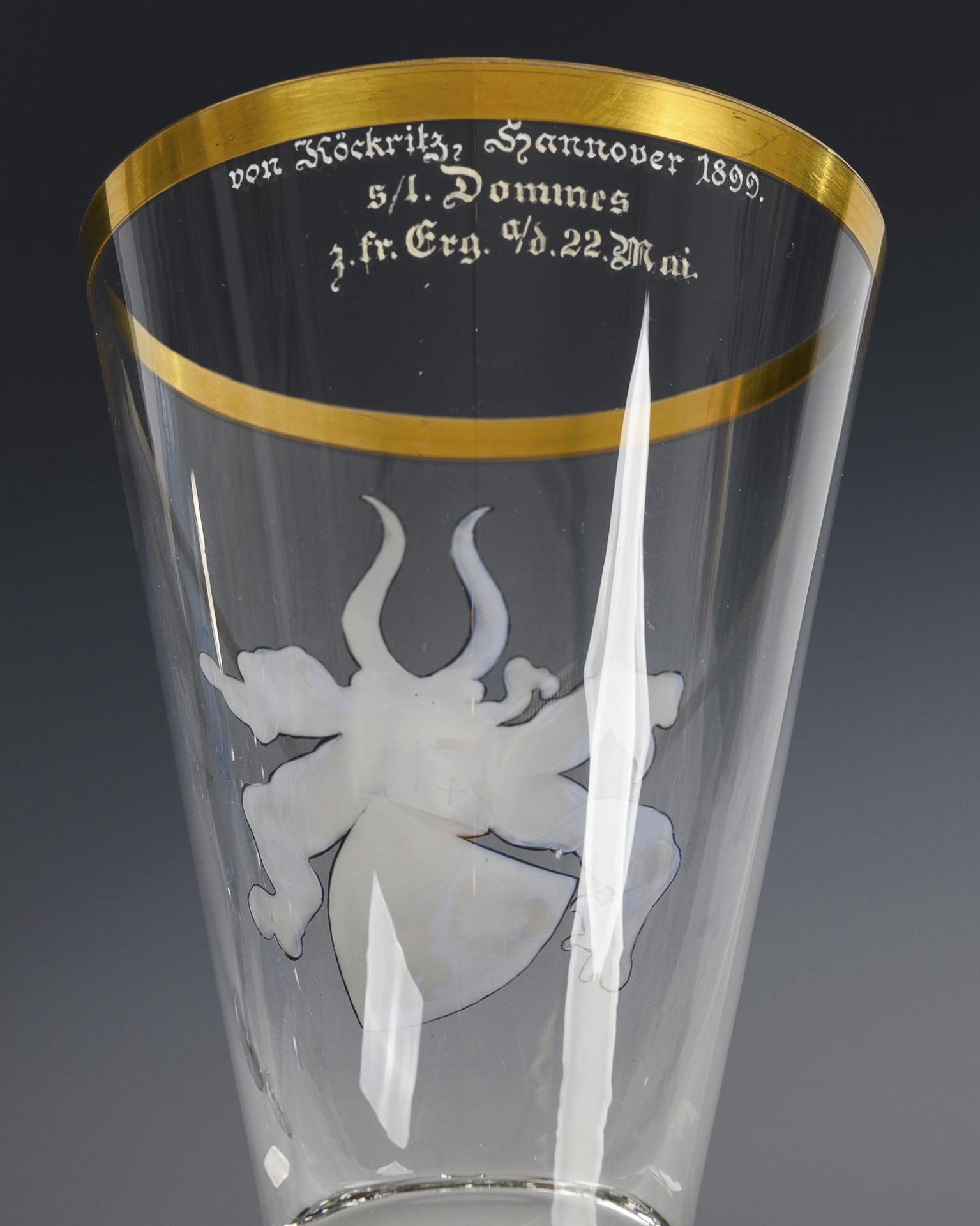 2 Spitzkelche aus farblosem Glas mit kobaltblauem Innenfang, eingestochenen Luftblasen, massivem, konischem Schaft und Rundfuß. / 1 Spitzkelch aus farblosem Glas mit einem schauseitigen, emailgemalten Wappen, eingestochenen Luftblasen, wabenfacettiertem Schaft, Rundfuß, unterseitig signiert "Gebr. Goedecke Hannover".
