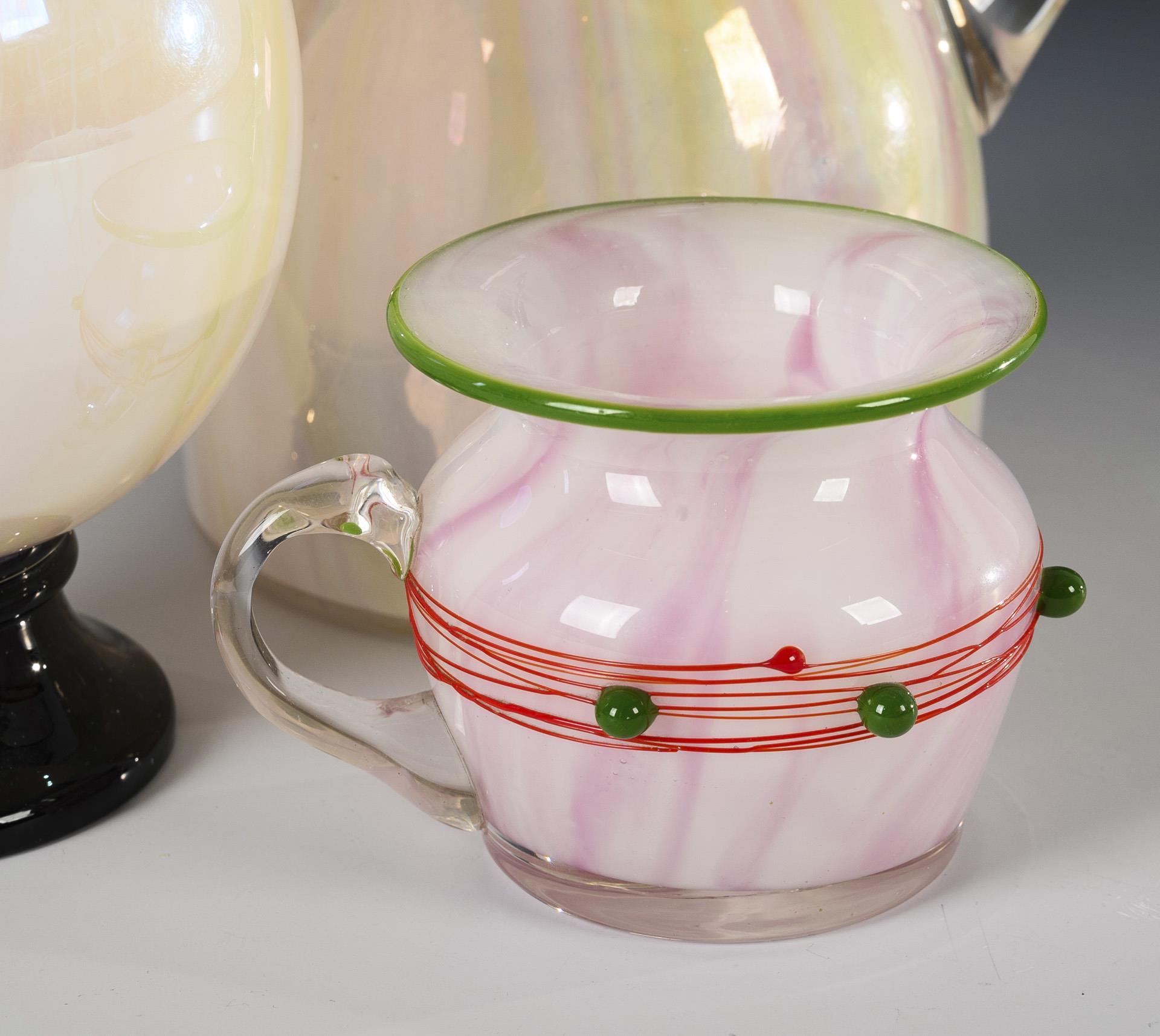 2x Entwurf von Jean Beck (1862-1938), um 1918: Krug (H 16 cm) und Bonboniere (H 17 cm) aus farblosem Glas mit rosa und gelb marmoriertem Opalglasinnenfang. / 1x Entwurf wohl von Georg Carl von Reichenbach (1872-1940): Henkelbecher mit Kraterrand, aus farblosem Glas mit rosa marmoriertem Opalglasinnenfang und grünem Rand, Korpus mit einem feinen roten Faden umsponnen und mit aufgelegten grünen Glastropfen (H 7,5 cm). Kleine Bestoßung am Bonbonierenrand.