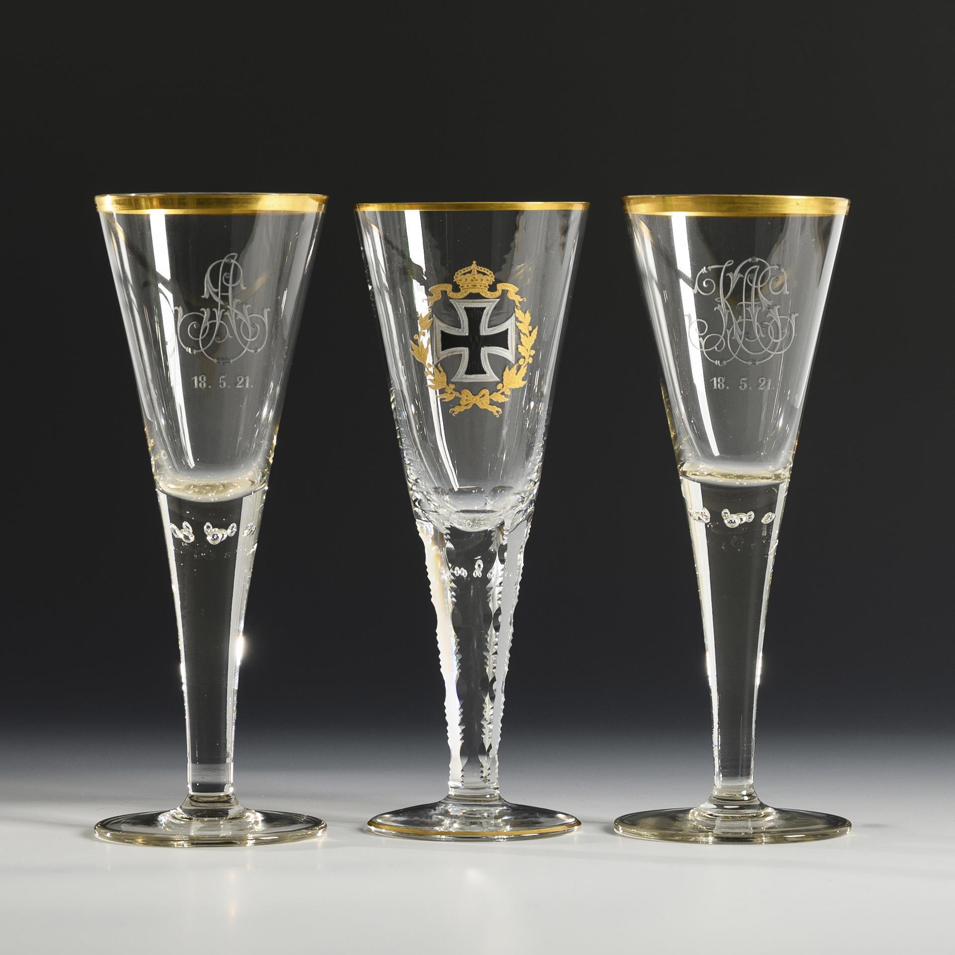 1x um 1914: konische, in den facettierten Schaft mit eingestochenen Luftblasen und geschlägelten Kanten übergehende Kuppa, Rundfuß; schauseitig ein geätztes Eisernes Kreuz im Lorbeerkranz, datiert "1914". / 2x 1921: konische, in den massiven Schaft mit eingestochenen Luftblasen übergehende Kuppa, Rundfuß; schauseitig das gravierte und datierte Monogramm "KAS" bzw. "AS" "18.5.21.". 2x minimaler Goldabrieb.