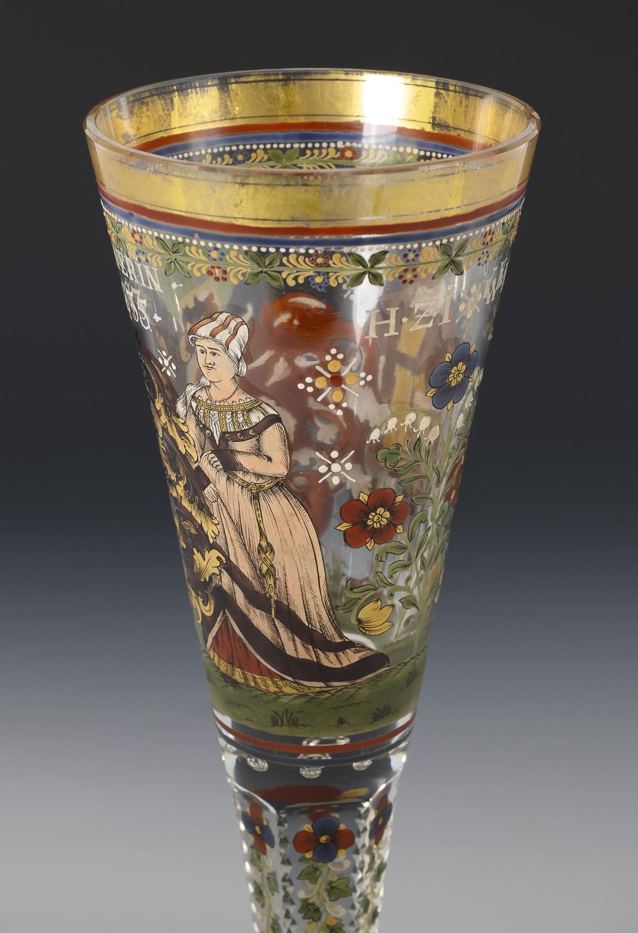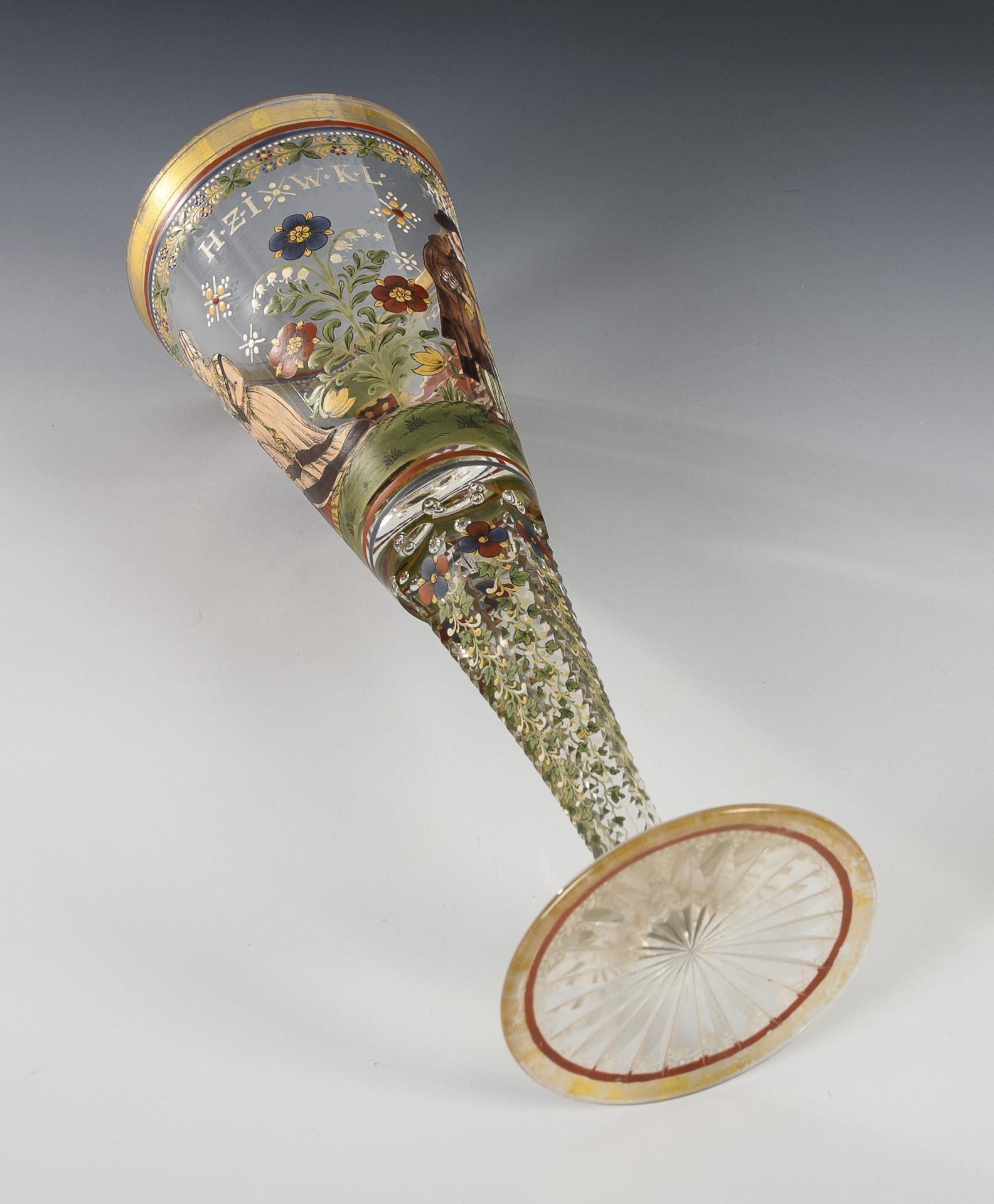 Farbloses Glas, polychrome Emailmalerei, Goldstaffage. H 34,5 cm.