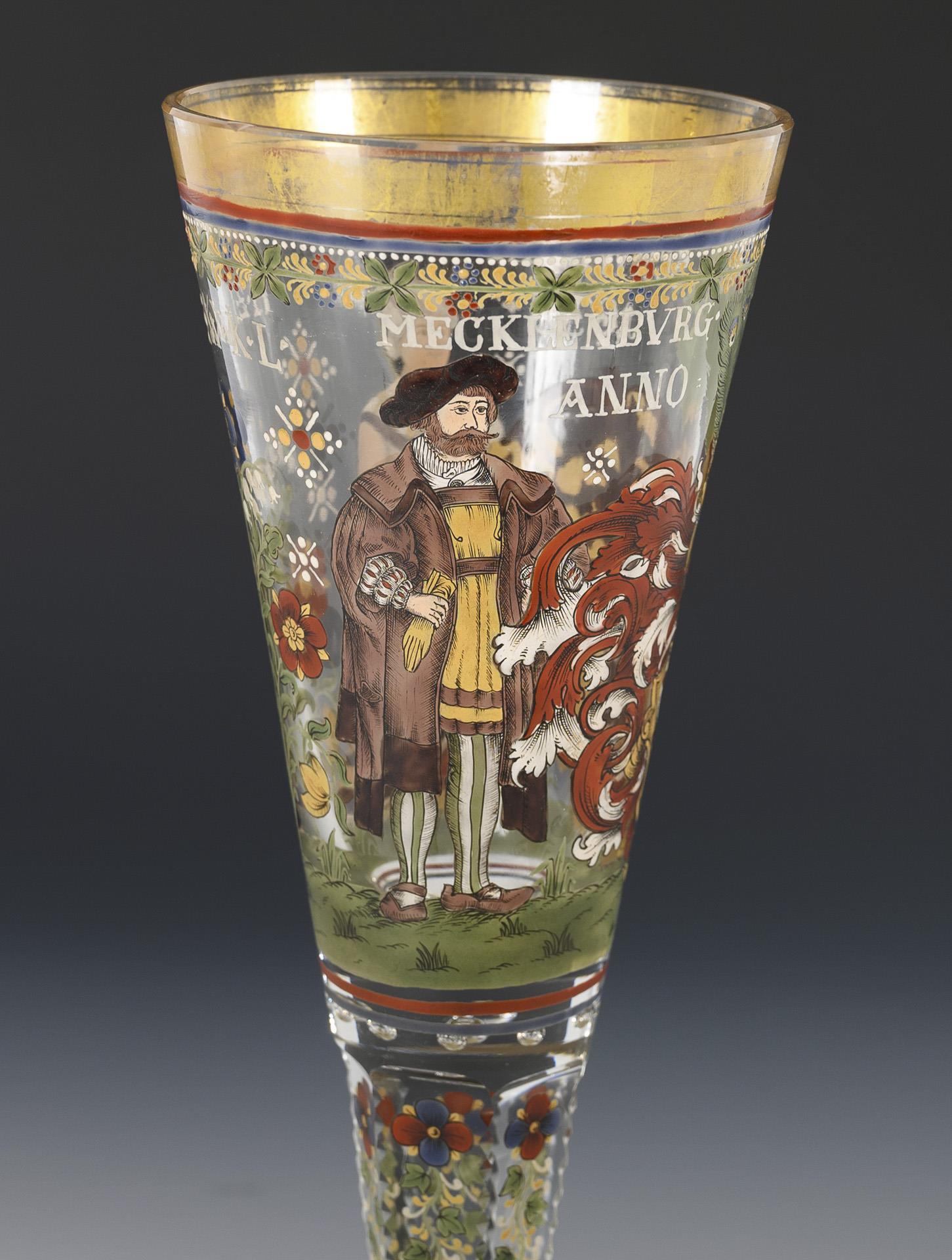 Konische, in den facettierten, gezänkelten Schaft übergehende Kuppa mit einem eingestochenen Luftblasenkranz am Kuppaboden, Rundfuß mit Bodenstern. Auf der Kuppa die Darstellung des von einem Edelmann und einer Edelfrau flankierten Mecklenburger Wappens mit der Bezeichnung "Mecklenburg Schwerin Anno 1635 HZI WKL". Gold berieben, Bestoßung am Mündungsrand.