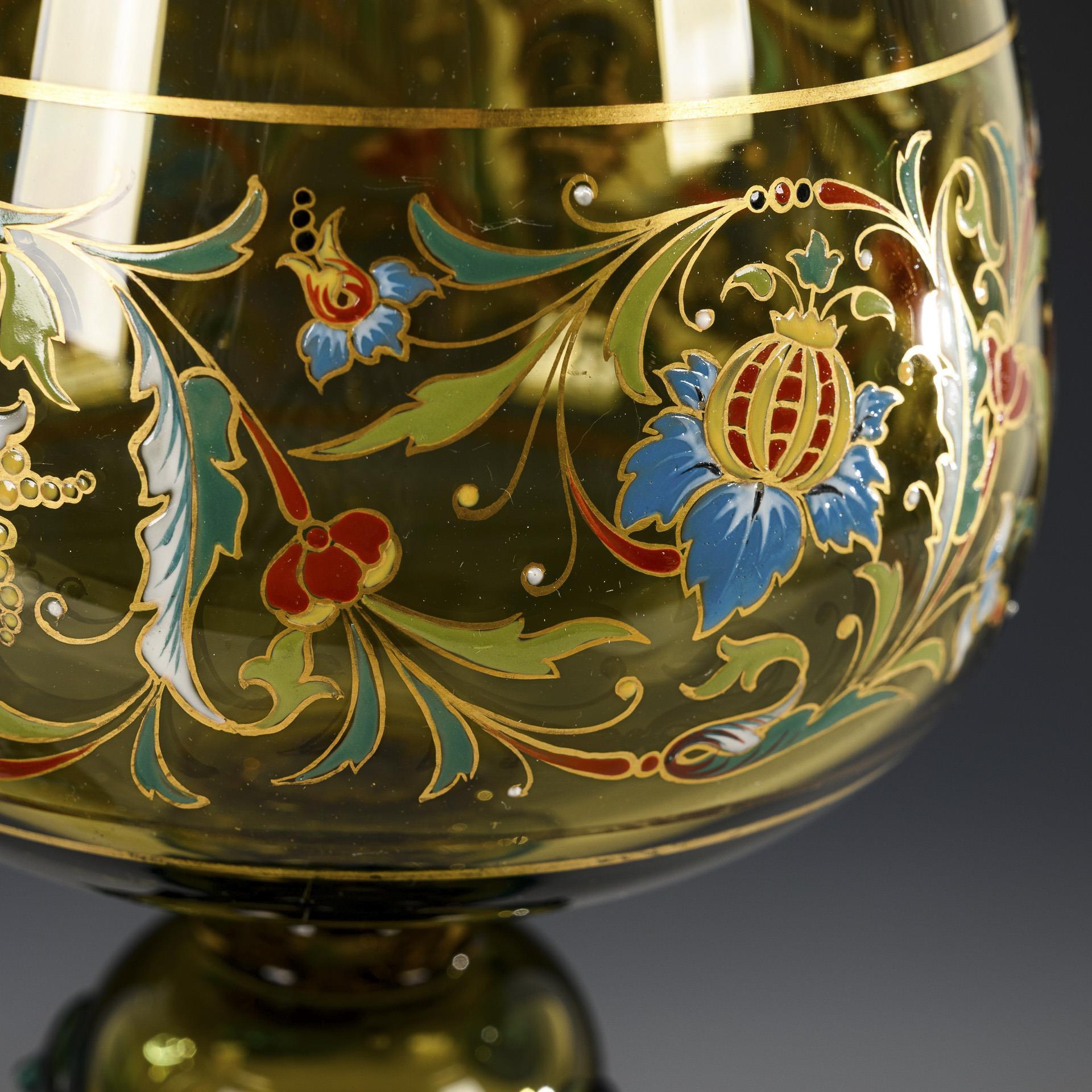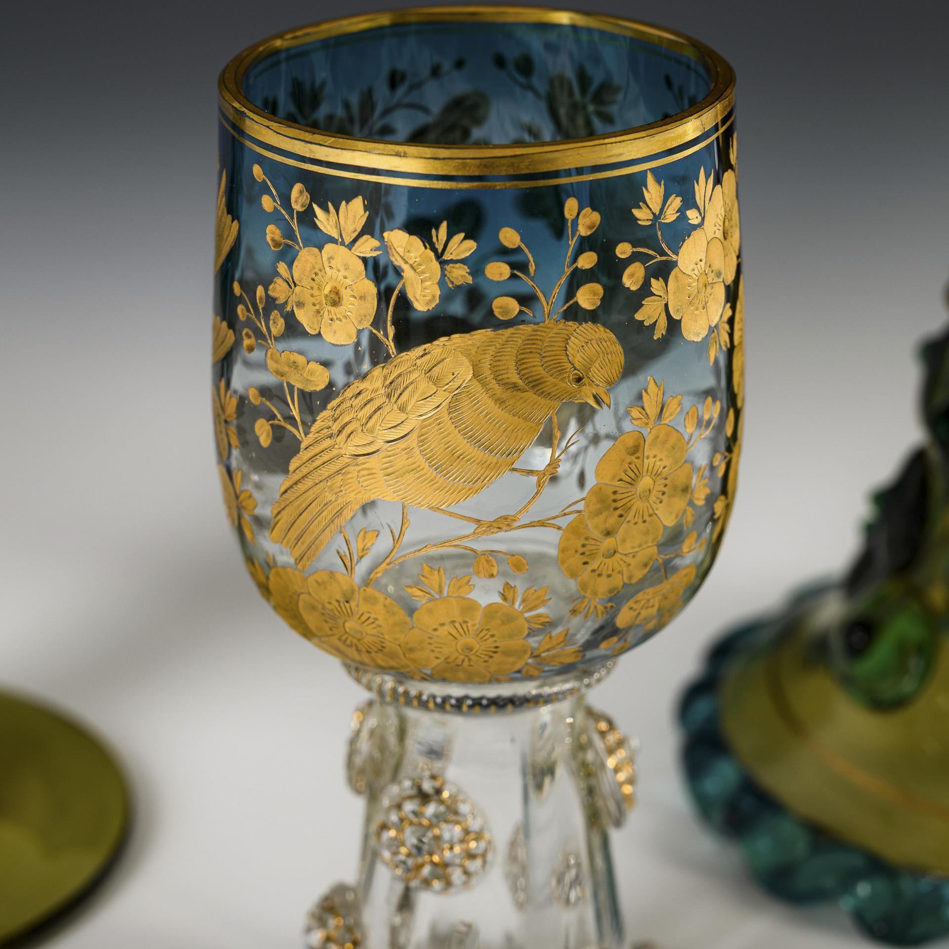 1x THERESIENTHAL: Großer Römer aus olivgrünem Glas mit bauchiger Kuppa, Hohlnodus mit aufgeschmolzenen, türkisfarbenen Nuppen, Trompetenfuß mit aufgeschmolzenen Nuppen und Wellenband in Türkis; auf der Kuppa polychrome Floral- und Goldmalerei (H 29,5 cm). / 1x Kelchglas aus olivgrünem und blauem Glas mit konischer Kuppa, vierpassigem Hohlnodus mit aufgeschmolzenen Beerennuppen, gedrehter Balusterschaft mit zwei aufgeschmolzenen Wellenbändern, Rundfuß (H 26 cm). / 1x Kelchglas mit längsoptisch gerippter Kuppa aus farblosem Glas mit blau verlaufendem Innenfang, geschnittenem und vergoldetem Vogel- und Blumendekor, optisch geblasener Trompetenfuß mit aufgeschmolzenen Beerennnuppen und gekniffenem Rand (H 14 cm).
