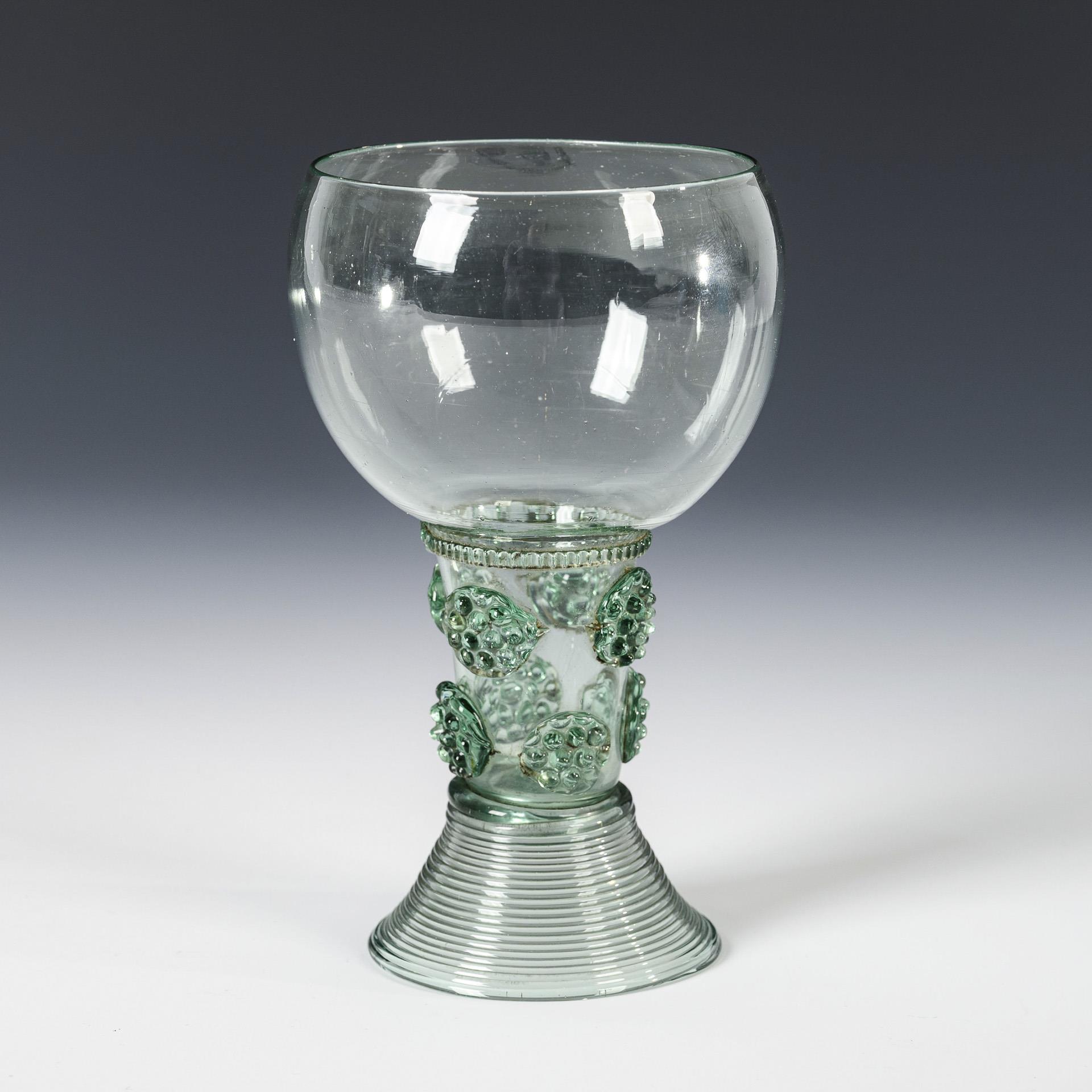 Bauchige Kuppa, zylindrischer, nach oben offener Hohlschaft mit Zwackelband und acht aufgelegten Beerennuppen, gesponnener Trompetenfuß; Abriss.