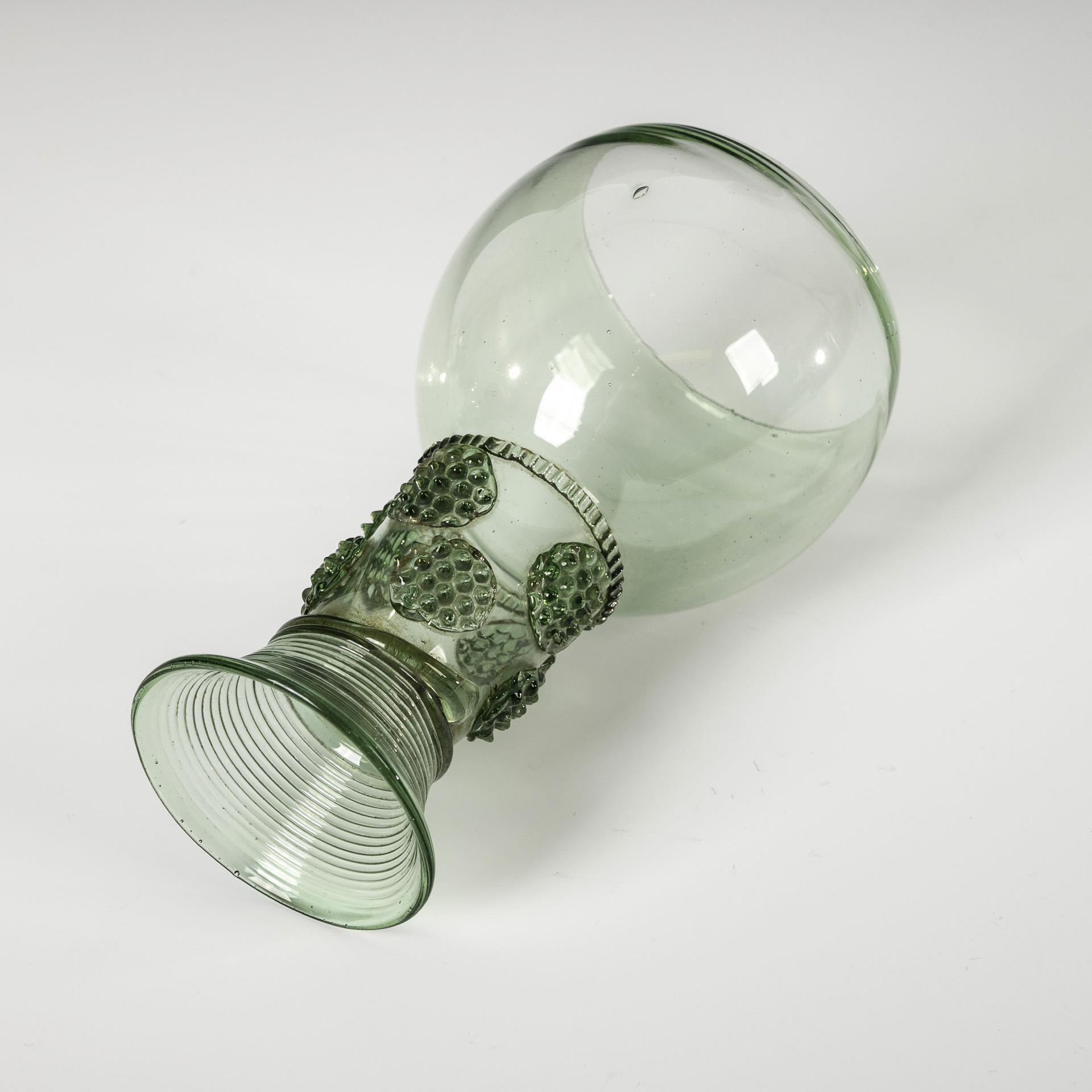Bauchige Kuppa, nach oben offener Zylinderschaft mit acht aufgelegten Beerennuppen, gesponnener Trompetenfuß; Abriss.
