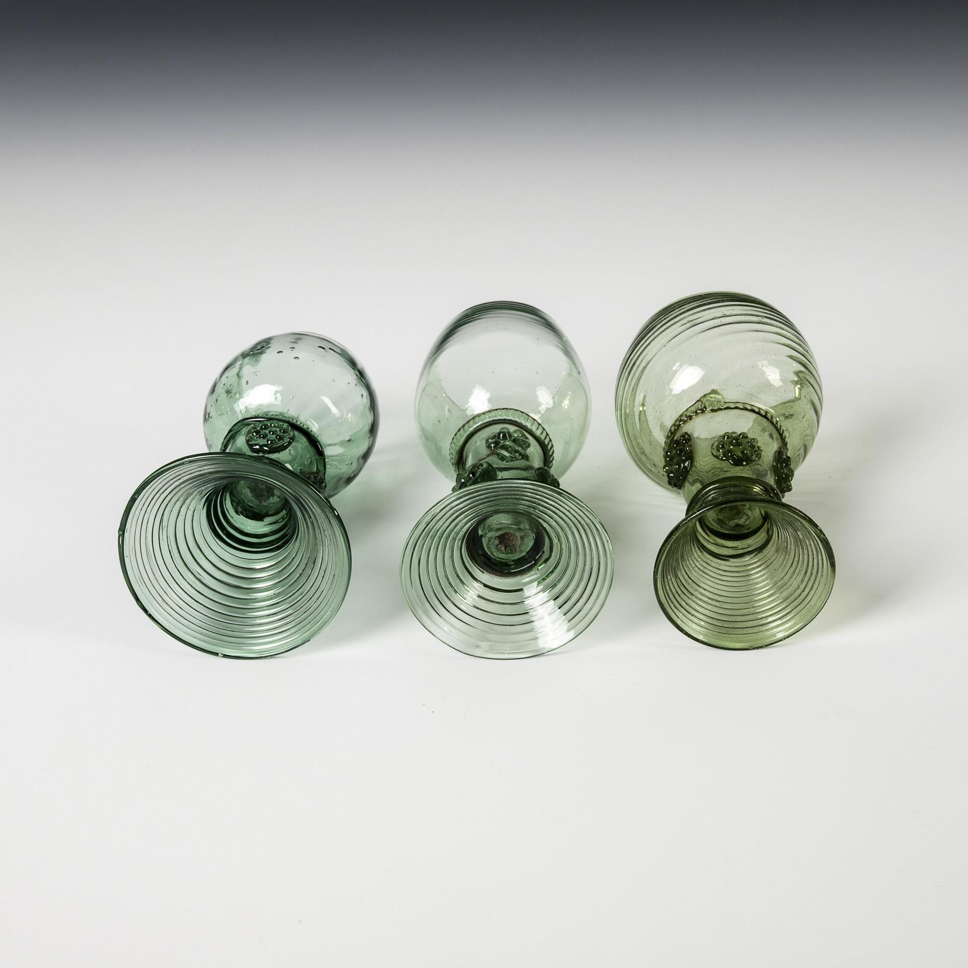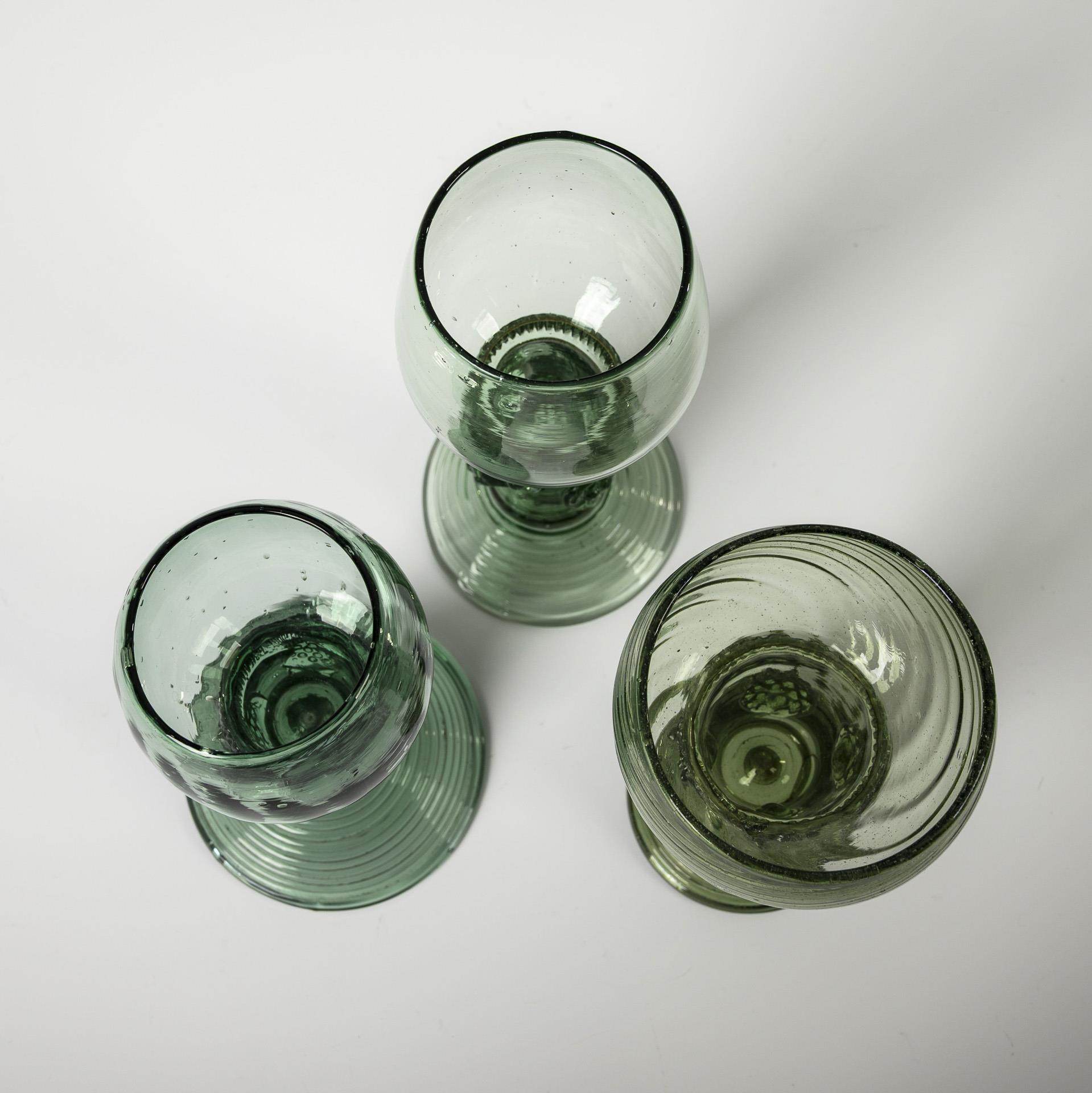 Grünes, etwas blasiges Glas. H 13, 13,5 und 15 cm. 240 g.