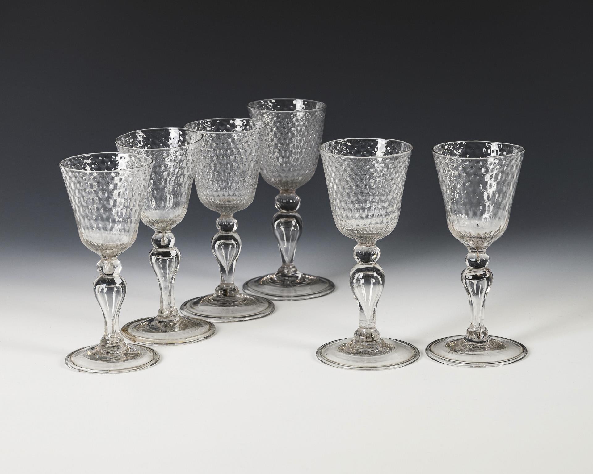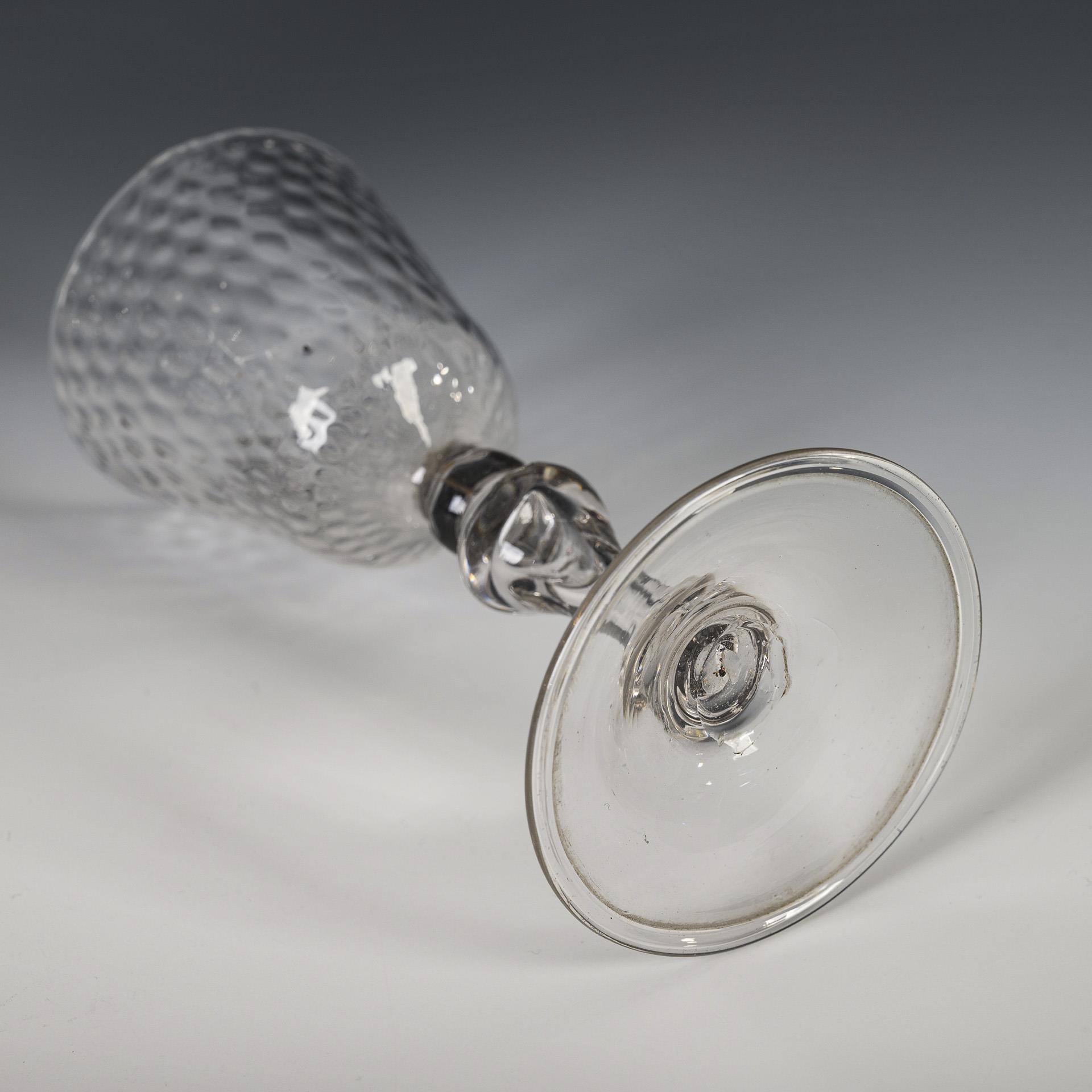 Glockenförmige, wabenoptisch formgeblasene Kuppa, gerippter Nodus, Balusterschaft mit eingestochener Luftblase, Rundfuß mit nach unten umgeschlagenem Rand; Abriss.