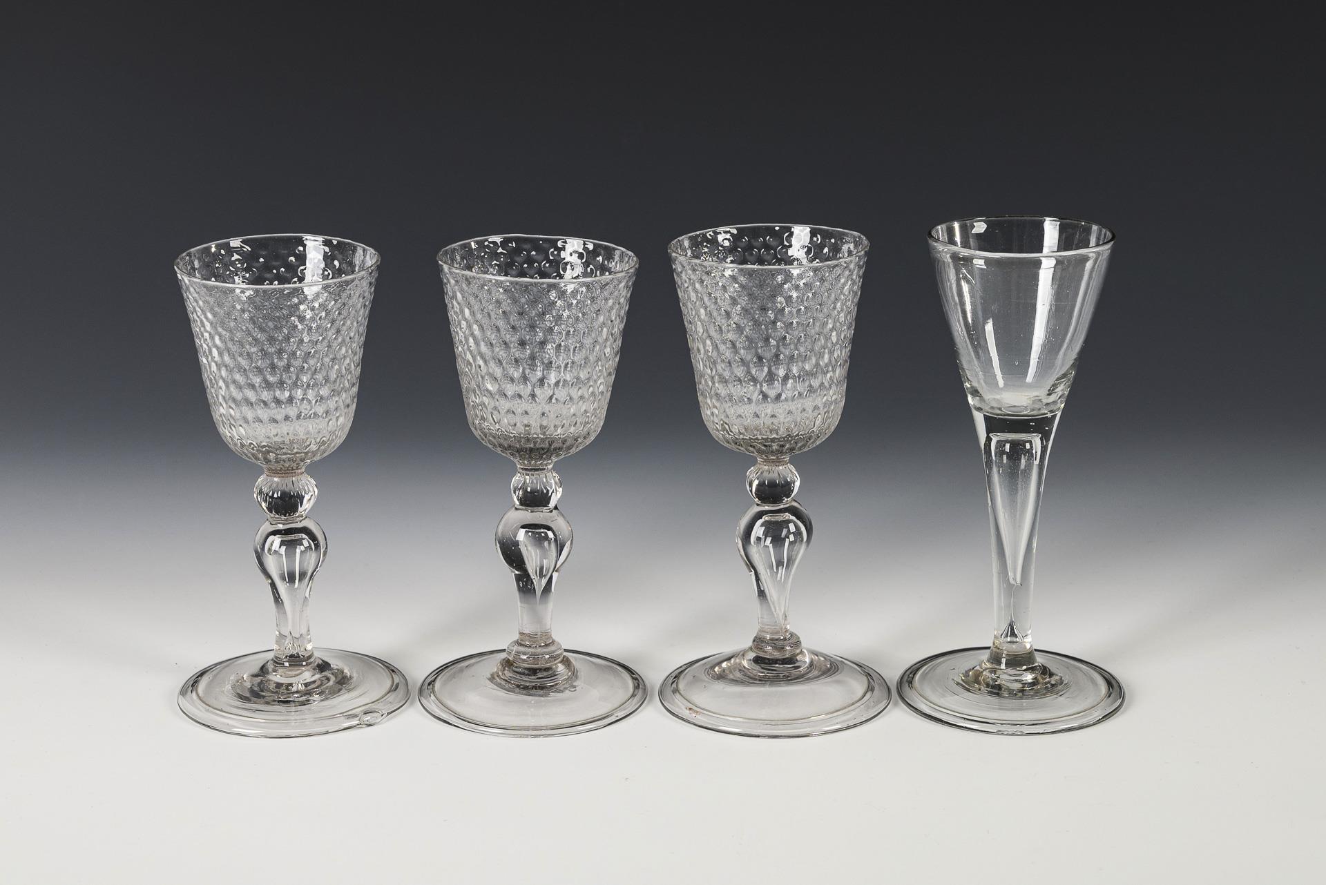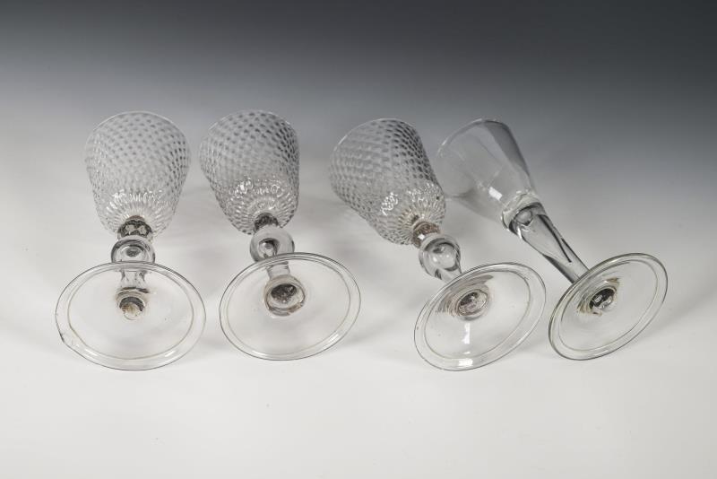 3x wohl Frankreich, 18. Jh.: glockenförmige, wabenoptisch formgeblasene Kuppa, gerippter Nodus, Balusterschaft mit eingestochener Luftblase, Rundfuß mit nach unten umgeschlagenem Rand; Abriss (H ca. 15,5 cm). / 1x Thüringen, 2. H. 18. Jh.; konische, in den Schaft mit eingestochener Luftblase übergehende Kuppa, Rundfuß mit nach unten umgeschlagenem Rand; Abriss (H 16 cm).