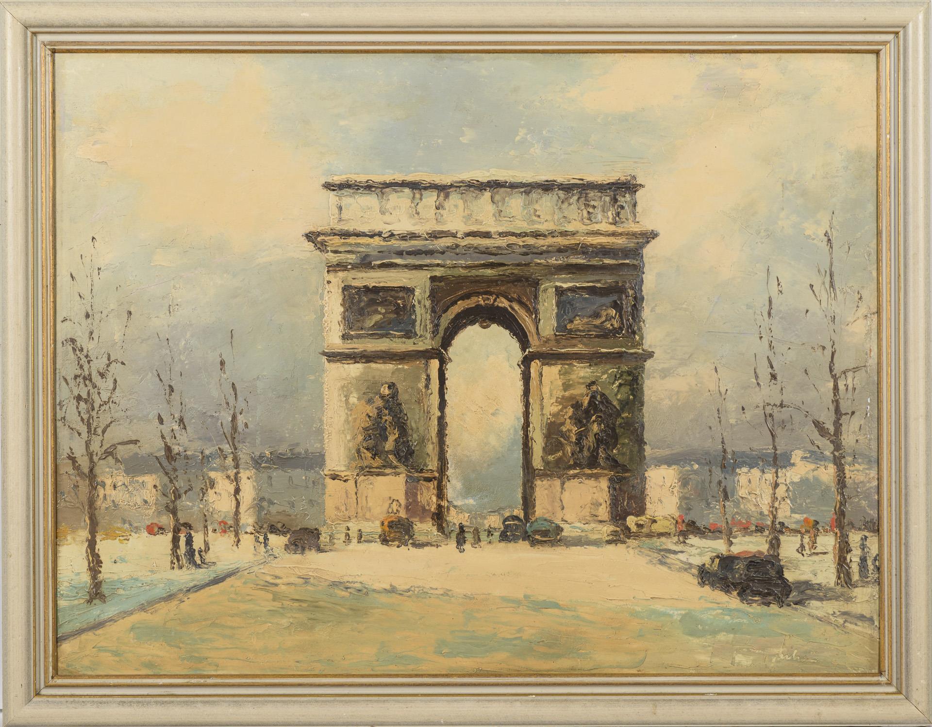 Mehrere Automobile an einem hellen Tag beim Triumphbogen unter bewölktem Himmel.