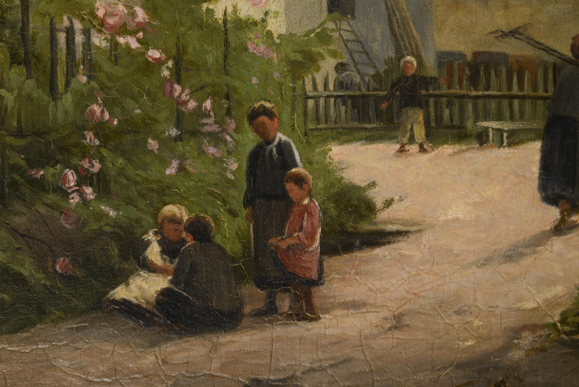 Kinder auf der Straße vor den blühenden Rosen bei den Häusern. Leichte Altersspuren.
