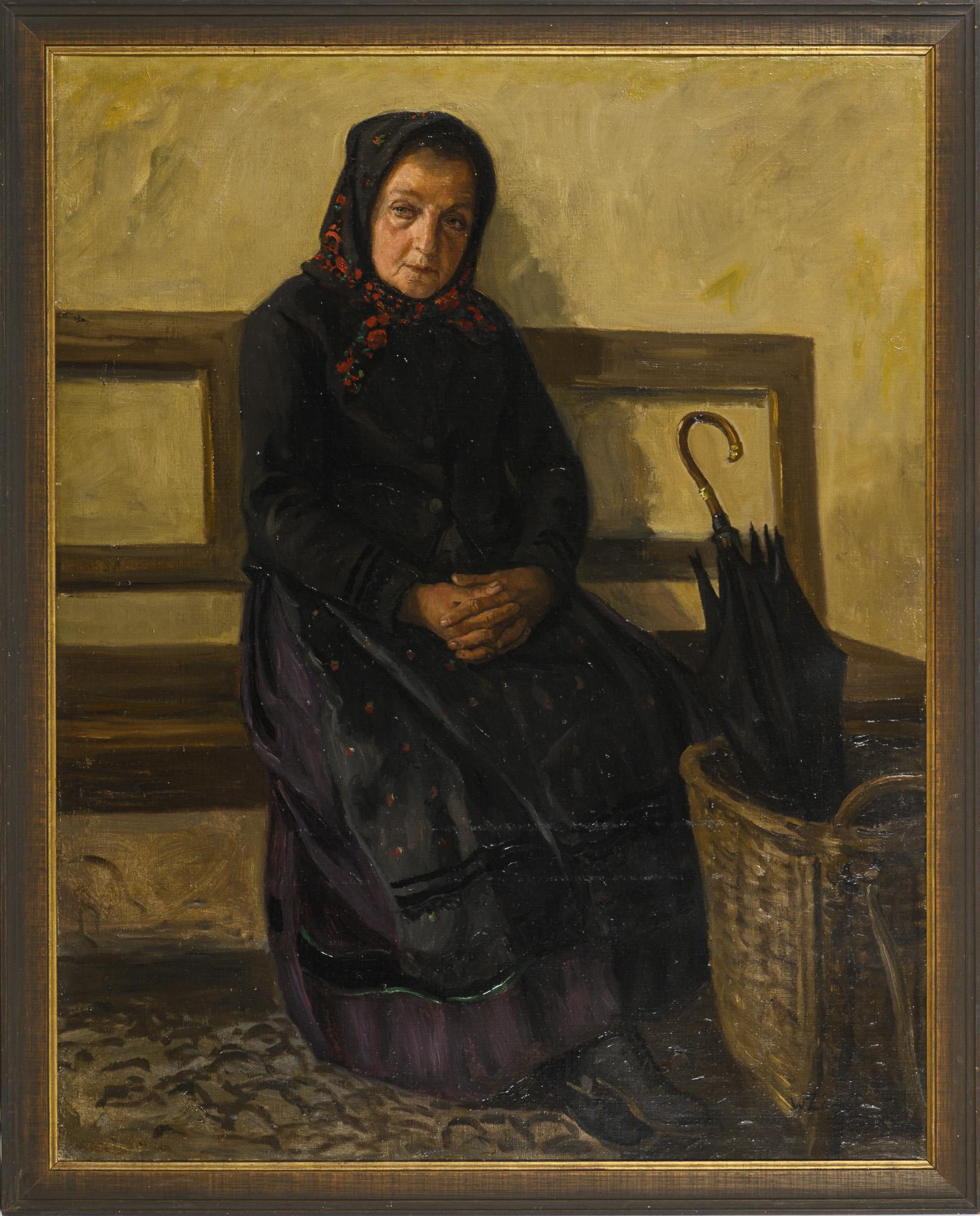 Ältere Dame in schwarz-violetter Kleidung mit geblümtem, schwarzen Kopftuch auf einer Bank. Leichte Altersspuren.