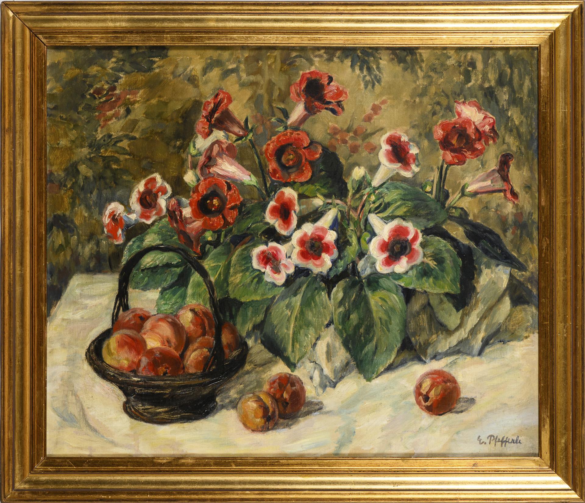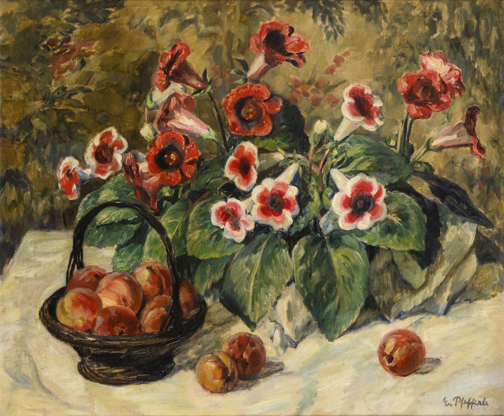 Pfirsiche in einem kleinen Korb neben Gloxinien auf einem weiß gedeckten Tisch. Leichte Altersspuren.