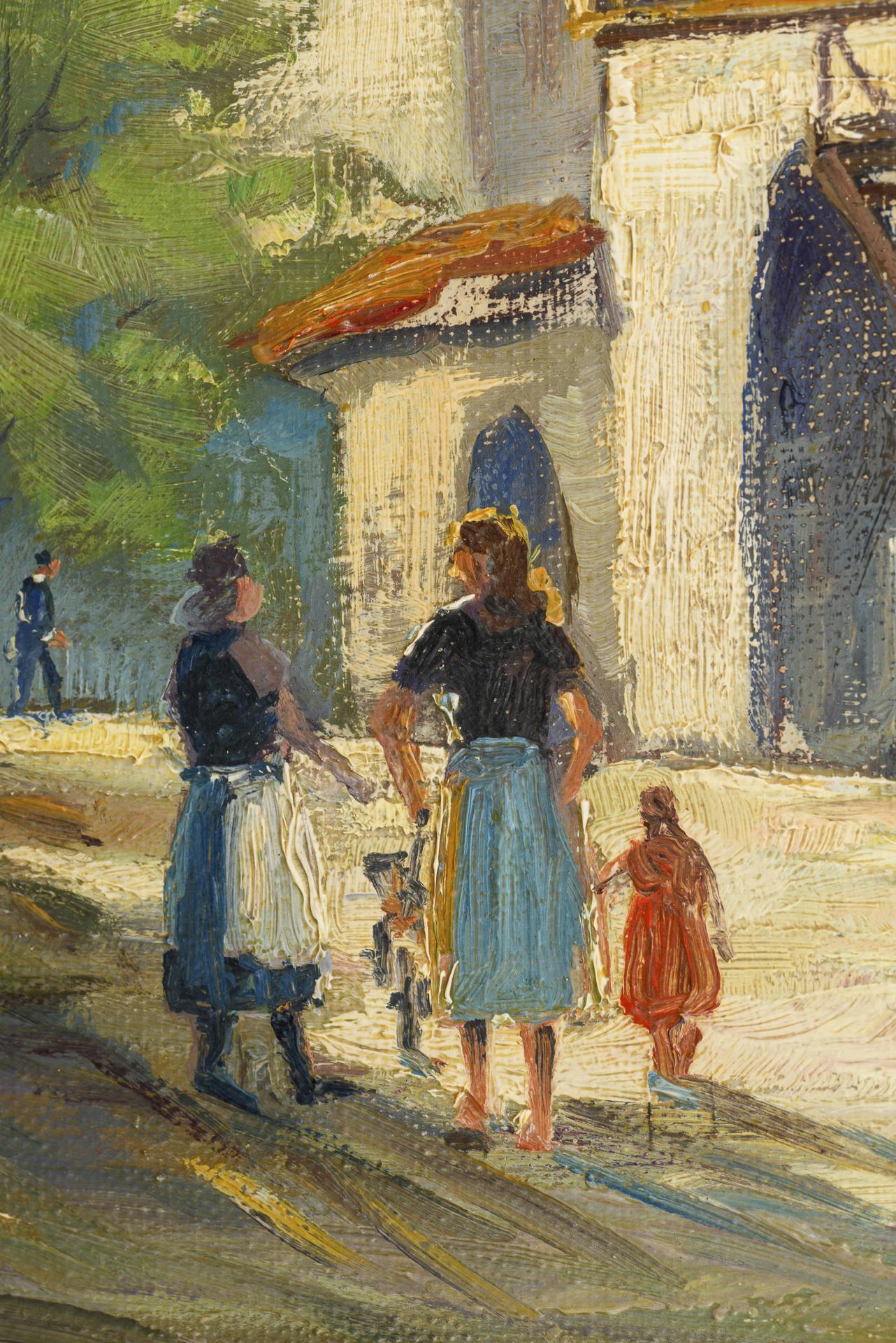 Staffagefiguren in der Sonne auf der Straße zwischen den Häusern.