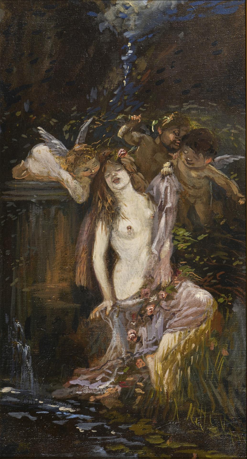 Quellnymphe mit mehreren Putten am Ufer eines Baches im hellen Licht. Leichte Altersspuren.