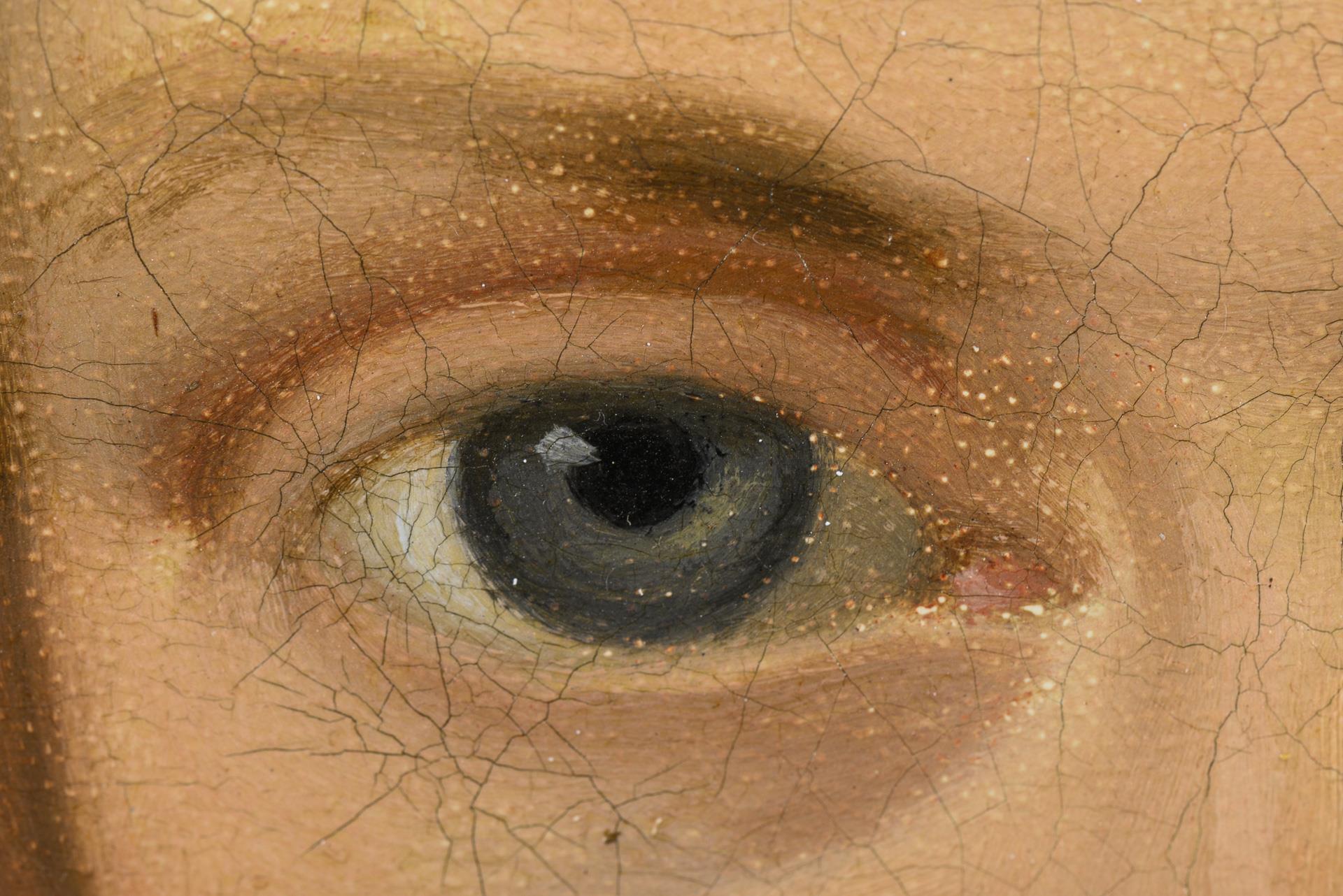 Bildnis einer jungen Frau im dunkelblauen Kleid mit goldener Brosche und schwarzem Mantel. Leichte Altersspuren.