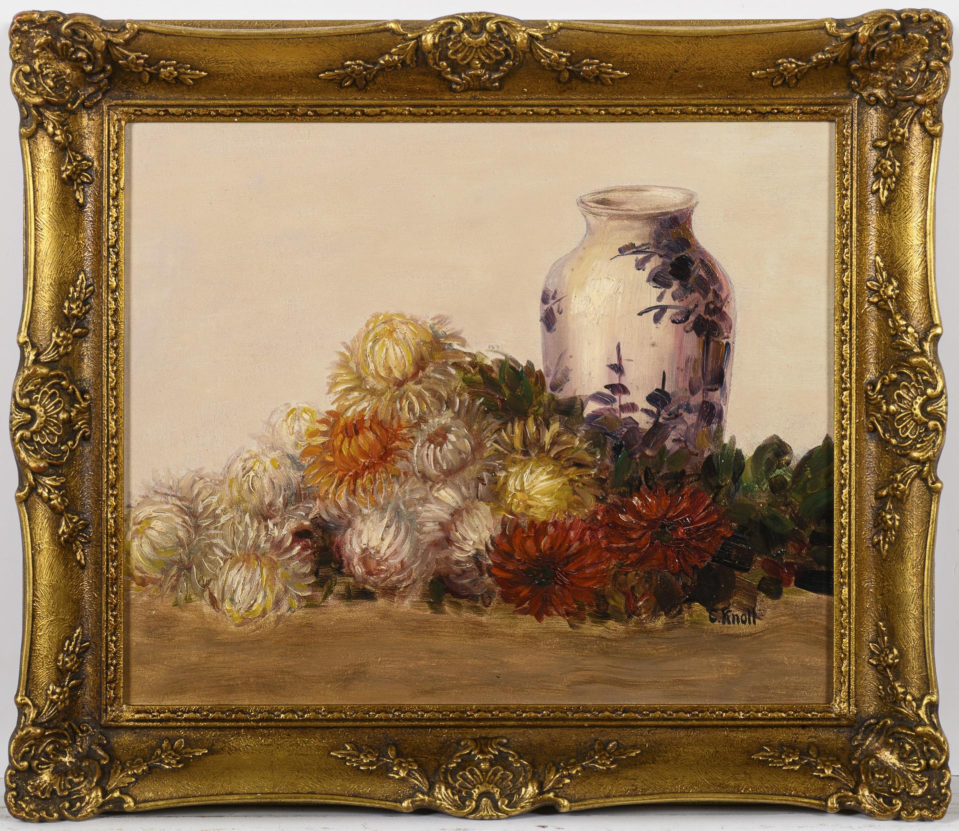 Herbstblumen neben bemalter Vase im hellen Licht.