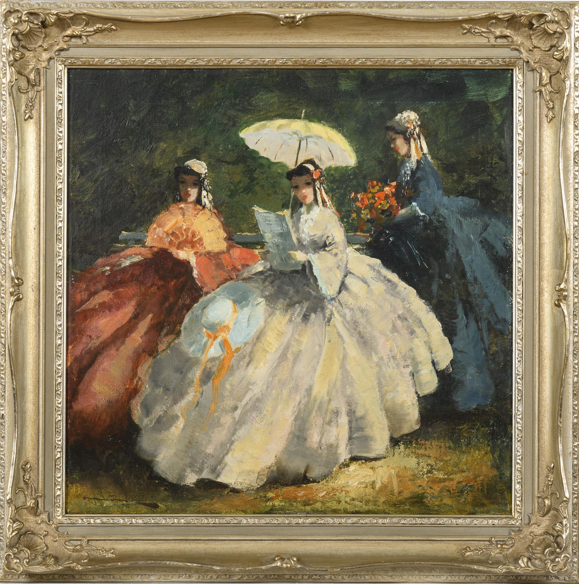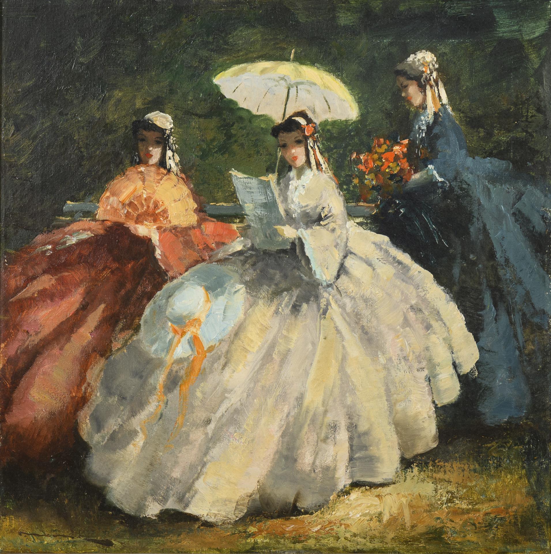 Die Frauen in weiten Kleidern mit Sonnenschirm und Fächer auf einer Parkbank.