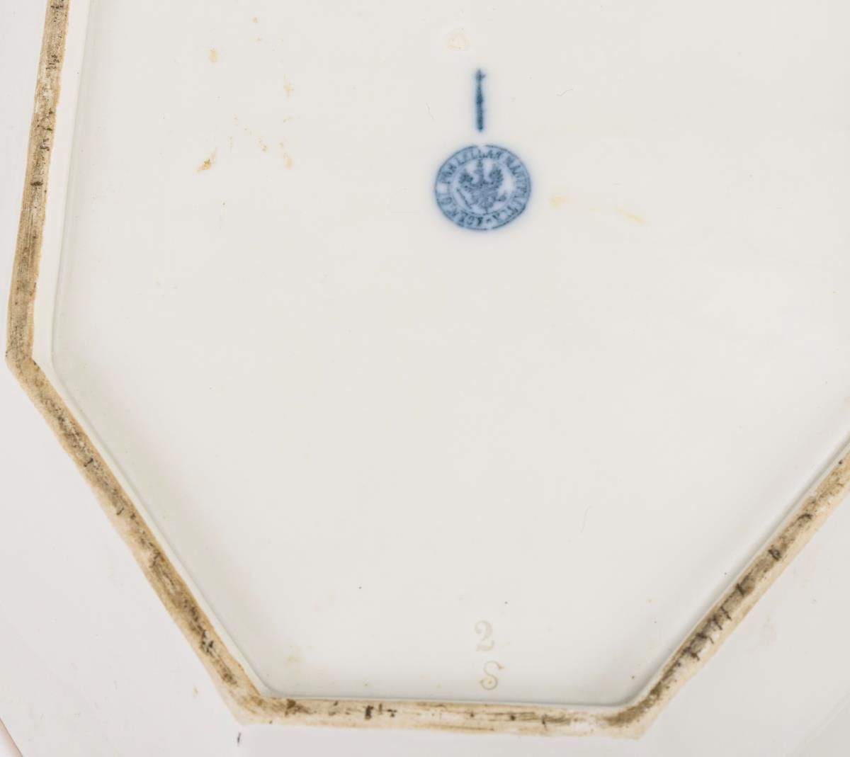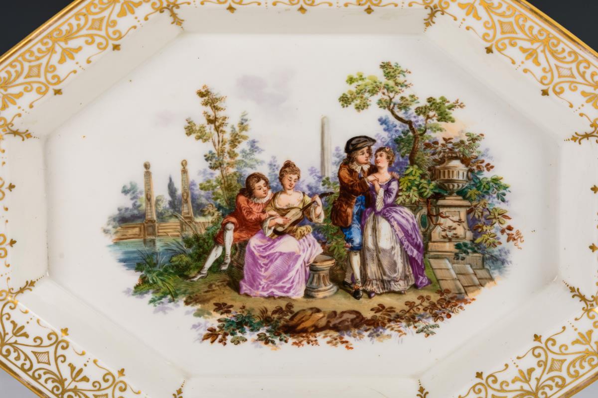 Oval-achteckige Schale mit einer galanten Parkszene im Spiegel und Goldbordüre. Minimaler Goldabrieb.