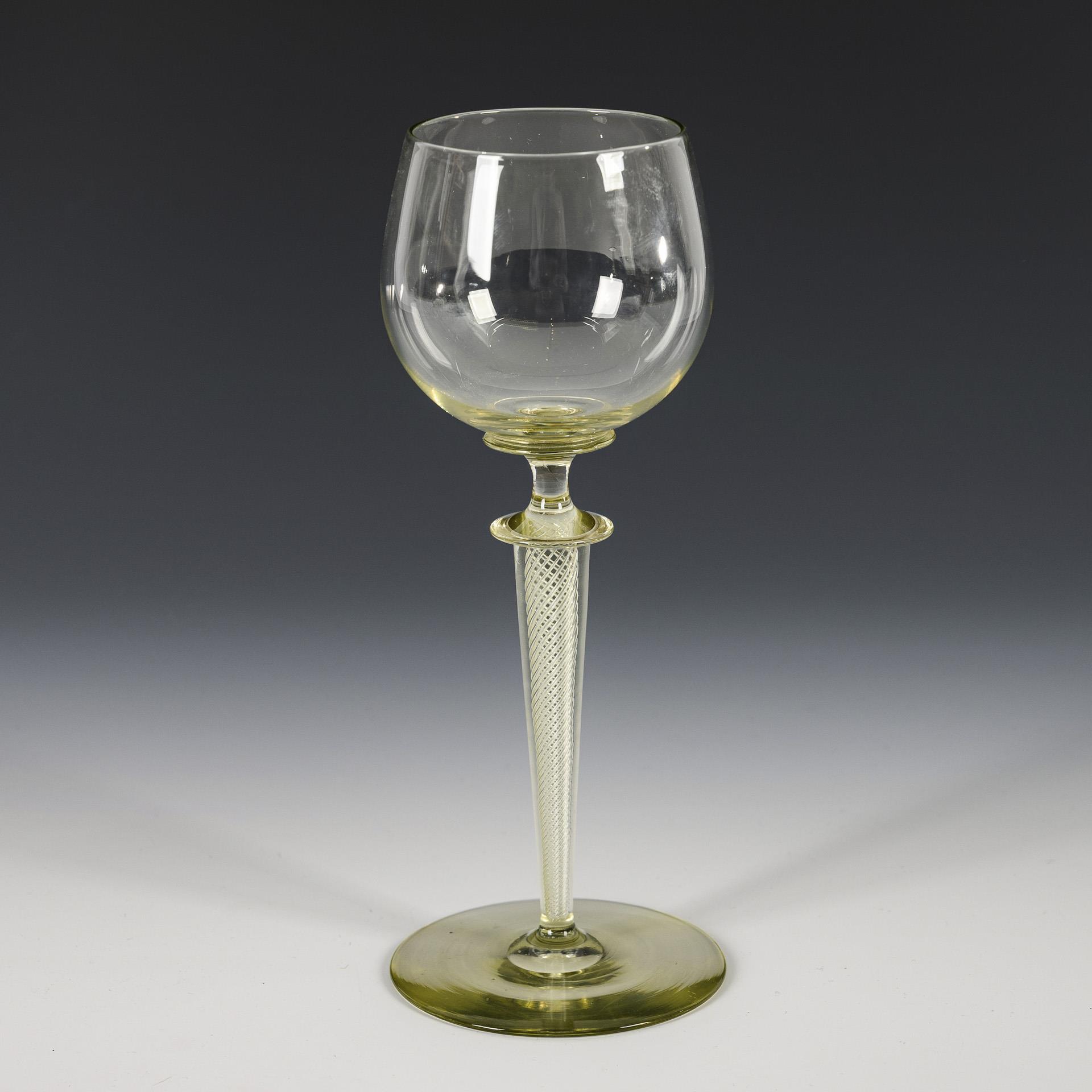 Bauchige Kuppa, zwei Scheibennodi, konischer Stängel mit Luftspirale, Rundfuß; ausgekugelter Abriss.