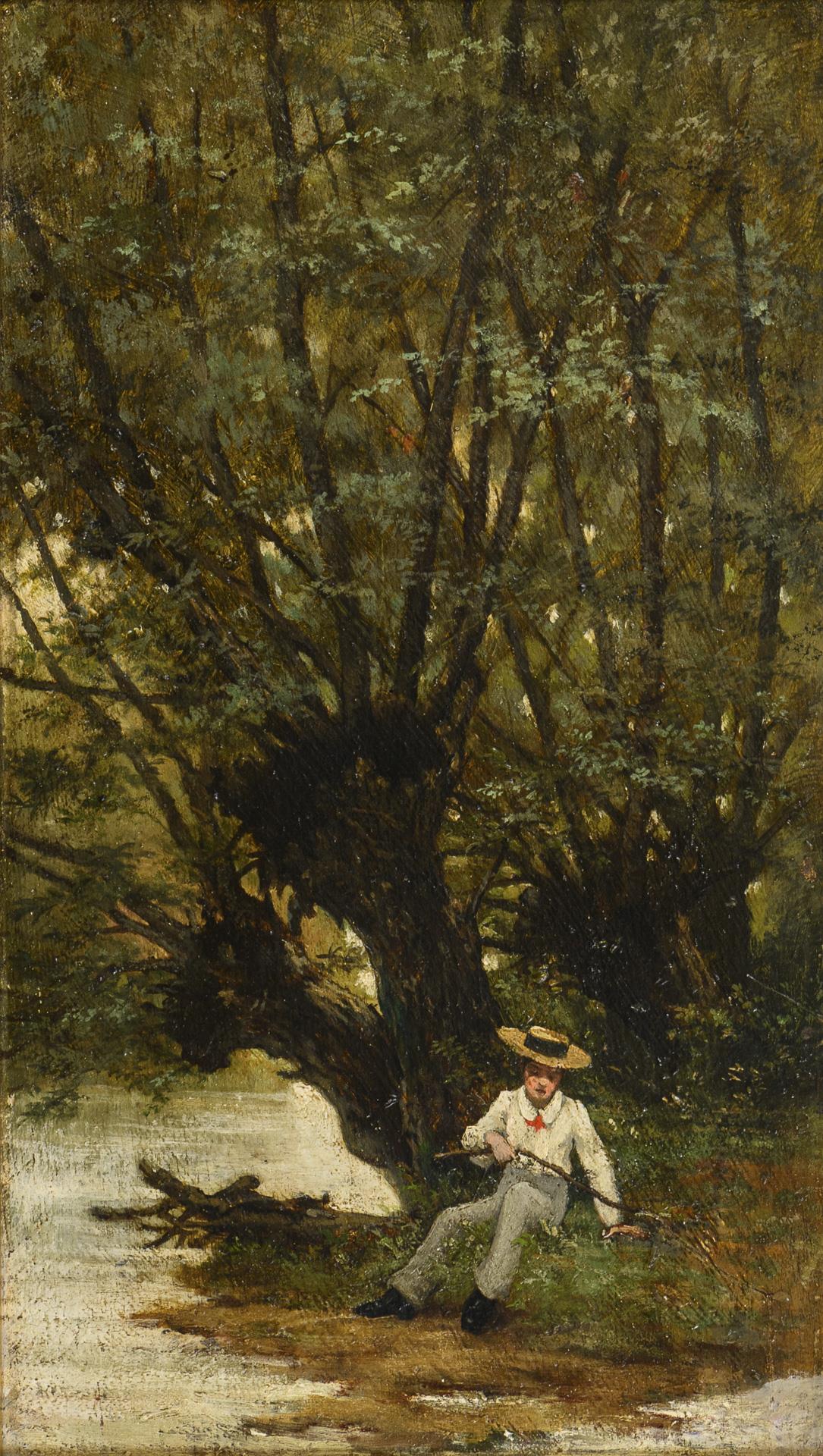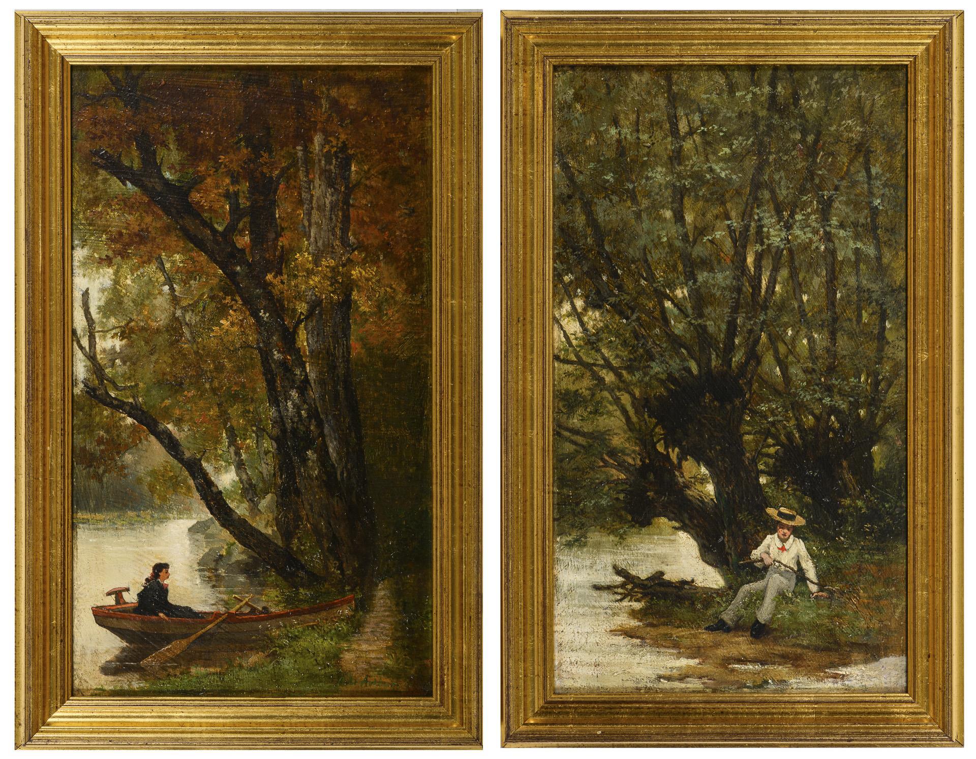 Junger Angler am Flussufer sowie junge Frau im Kahn am Ufer.