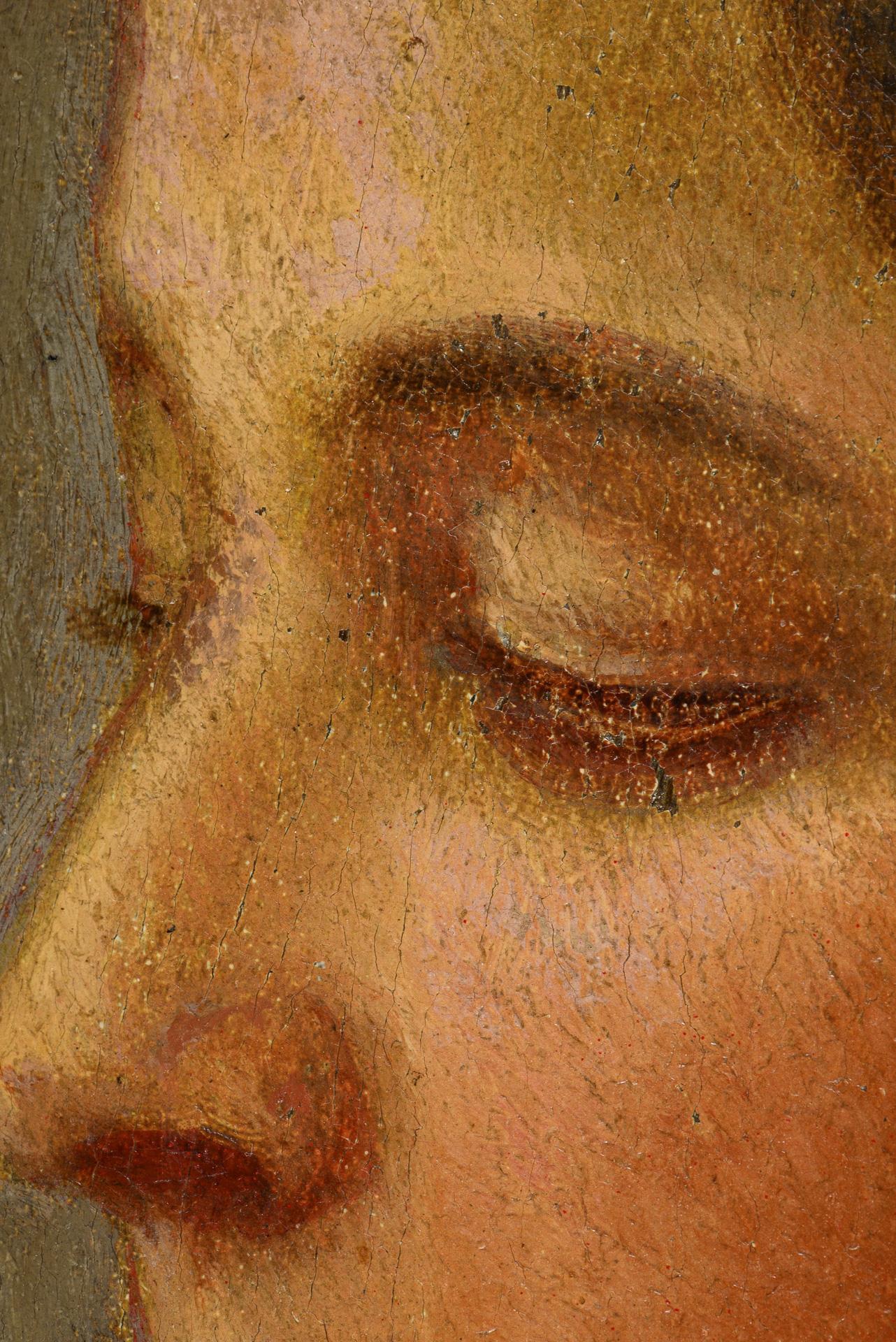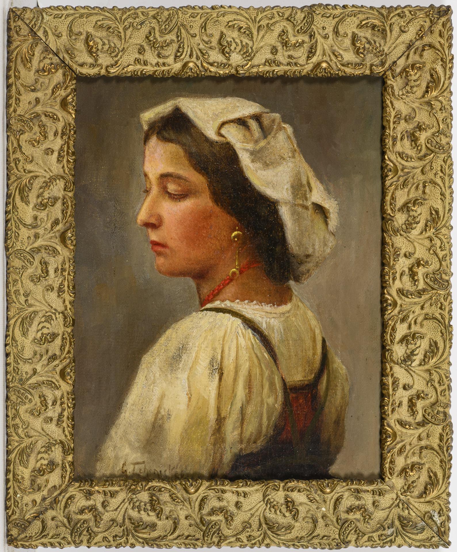 Bildnis einer jungen Frau in ländlicher Kleidung vor neutralem Hintergrund. Leichte Altersspuren.
